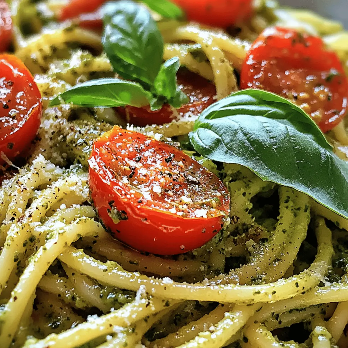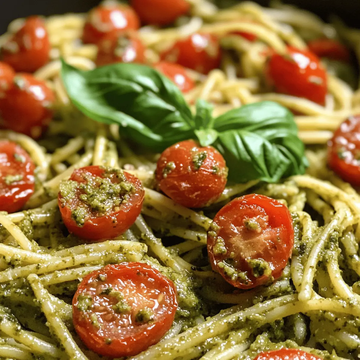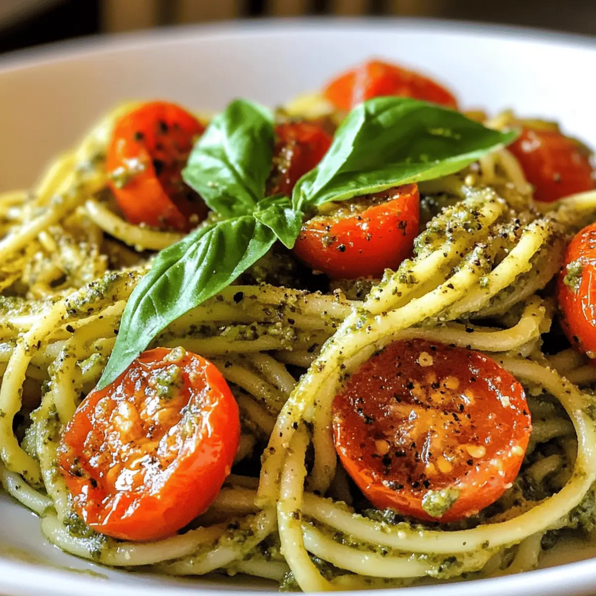 As the oven hums softly in the background, the scent of roasted tomatoes fills my kitchen, transporting me to a sun-drenched Italian terrace. There’s something magical about whipping up a bowl of Creamy Vegan Pesto Pasta with Roasted Tomatoes, especially when it comes together in just 30 minutes. This recipe isn’t just quick and easy; it’s also a delightful way to enjoy a comforting, plant-based meal without sacrificing flavor. With each twirl of spaghetti, the tangy pesto marries perfectly with the sweetness of blistered tomatoes and the creamy richness of vegan cream cheese, creating a dish that’s as pleasing to the eyes as it is to the palate. Are you ready to bring a little Italian inspiration into your evening routine? Let’s dive into this deliciously simple recipe! Why Choose This Pesto Pasta? Quick and Easy: In just 30 minutes, you can create this gourmet dish, perfect for busy weeknights that need a touch of comfort. Amazing Flavor Combination: The sweetness of roasted tomatoes paired with the zingy vegan pesto brings out a taste explosion that will keep you coming back for seconds. Creamy Texture: Thanks to the vegan cream cheese, each bite of this pasta is luxuriously smooth, providing a delightful contrast to the roasted medley. Crowd-Pleasing: Perfect for both family meals and impressing guests, this recipe has broad appeal, ensuring even the meat-lovers won’t miss the dairy. Healthy Twist: With vegan and dairy-free ingredients, you can indulge without the guilt! It’s a great option for those looking to eat healthily or explore plant-based meals. Looking for more culinary inspiration? Check out my recipes like the Sweet Spicy Pasta or try these delicious Salmon Bites Zesty for a complete meal experience! Pesto Pasta with Roasted Tomatoes Ingredients • Bring the vibrant flavors of Italy to your table with these simple ingredients! For the Roasted Tomatoes Cherry Tomatoes – Adds natural sweetness and vibrant flavor when roasted; use grape tomatoes as a substitute if needed. Olive Oil – Enhances the roasting process and adds richness; vegetable broth can be used for a lighter, oil-free version. Italian Seasoning – Provides a blend of herbs for aromatic depth; dried herbs like oregano or basil can work equally well. Salt & Pepper – Essential for seasoning; adjust to taste for optimal flavor. For the Pasta and Sauce Vegan Pesto – Provides the base sauce flavor; traditional pesto with parmesan can be used for non-vegan options. Vegan Cream Cheese – Creates the creaminess in the sauce; alternatives like cashew cream or plant-based yogurt work too. Cooked Spaghetti – Serves as the main carbohydrate base, offering the perfect texture; feel free to use any pasta shape or gluten-free option. Vegan Parmesan – For topping and adds a cheesy flavor; nutritional yeast can also be a great cheese alternative. Fresh Basil Leaves – Adds freshness and a burst of flavor; can be omitted or substituted with dried basil if necessary. This delightful combination of ingredients is what makes this Pesto Pasta with Roasted Tomatoes recipe a must-try! Step‑by‑Step Instructions for Creamy Vegan Pesto Pasta with Roasted Tomatoes Step 1: Roast Tomatoes Preheat your oven to 400°F (200°C). On a baking tray, toss the cherry tomatoes with olive oil, Italian seasoning, salt, and pepper until they are well coated. Spread them out in a single layer and roast for 20-25 minutes, or until the tomatoes are soft and blistered, releasing their sweet juices. Step 2: Make the Sauce Once the roasted tomatoes are out of the oven, immediately mix in the vegan pesto and vegan cream cheese. Stir gently until the ingredients are thoroughly combined, allowing the heat from the tomatoes to soften the cream cheese, creating a creamy, vibrant sauce that clings beautifully to the tomatoes. Step 3: Add the Pasta In a large pot, ensure your spaghetti is cooked according to package instructions, then drain it, reserving a splash of the pasta water. Add the warm spaghetti directly into the roasted tomato and pesto mixture. Toss everything together well so that each strand of pasta is coated in the luscious sauce, adding a bit of the reserved pasta water if necessary to achieve your desired consistency. Step 4: Finish & Serve Serve the creamy vegan pesto pasta warm, garnishing each plate with a sprinkle of vegan parmesan and fresh basil leaves for an added burst of flavor. Make sure to present it beautifully, ensuring each bite of this delicious Pesto Pasta with Roasted Tomatoes is as delightful to the eyes as it is to the palate! How to Store and Freeze Pesto Pasta with Roasted Tomatoes Fridge: Store your creamy vegan pesto pasta in an airtight container for up to 3 days. Make sure it cools down before sealing to retain freshness. Freezer: For longer storage, freeze the pasta in a freezer-safe container for up to 2 months. Thaw overnight in the fridge before reheating. Reheating: To warm up, gently heat in a pan with a splash of water or plant milk to loosen the sauce. Stir well until heated through for the best texture. Texture Note: The creamy consistency may vary after storage, so adjust with pasta water or additional vegan cream cheese if necessary. What to Serve with Creamy Vegan Pesto Pasta with Roasted Tomatoes Elevate your meal with delightful pairings that complement the flavors and textures of this rich, comforting pasta dish. Crisp Green Salad: The refreshing crunch of mixed greens with a zesty vinaigrette cuts through the creaminess, adding a bright contrast. Garlic Bread: Warm, toasted garlic bread provides a perfect vessel to soak up any remaining pesto sauce and adds a delightful buttery touch. Roasted Veggies: Seasonal roasted vegetables—think bell peppers or zucchini—offer a satisfying roasted sweetness that complements the pasta without overwhelming it. Caprese Skewers: Juicy cherry tomatoes, creamy vegan mozzarella, and fresh basil on skewers add a burst of flavor while echoi