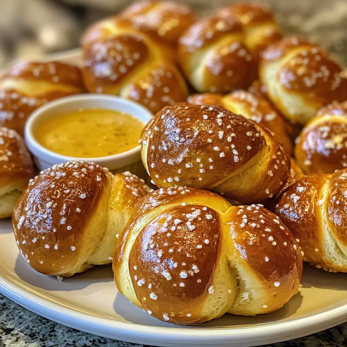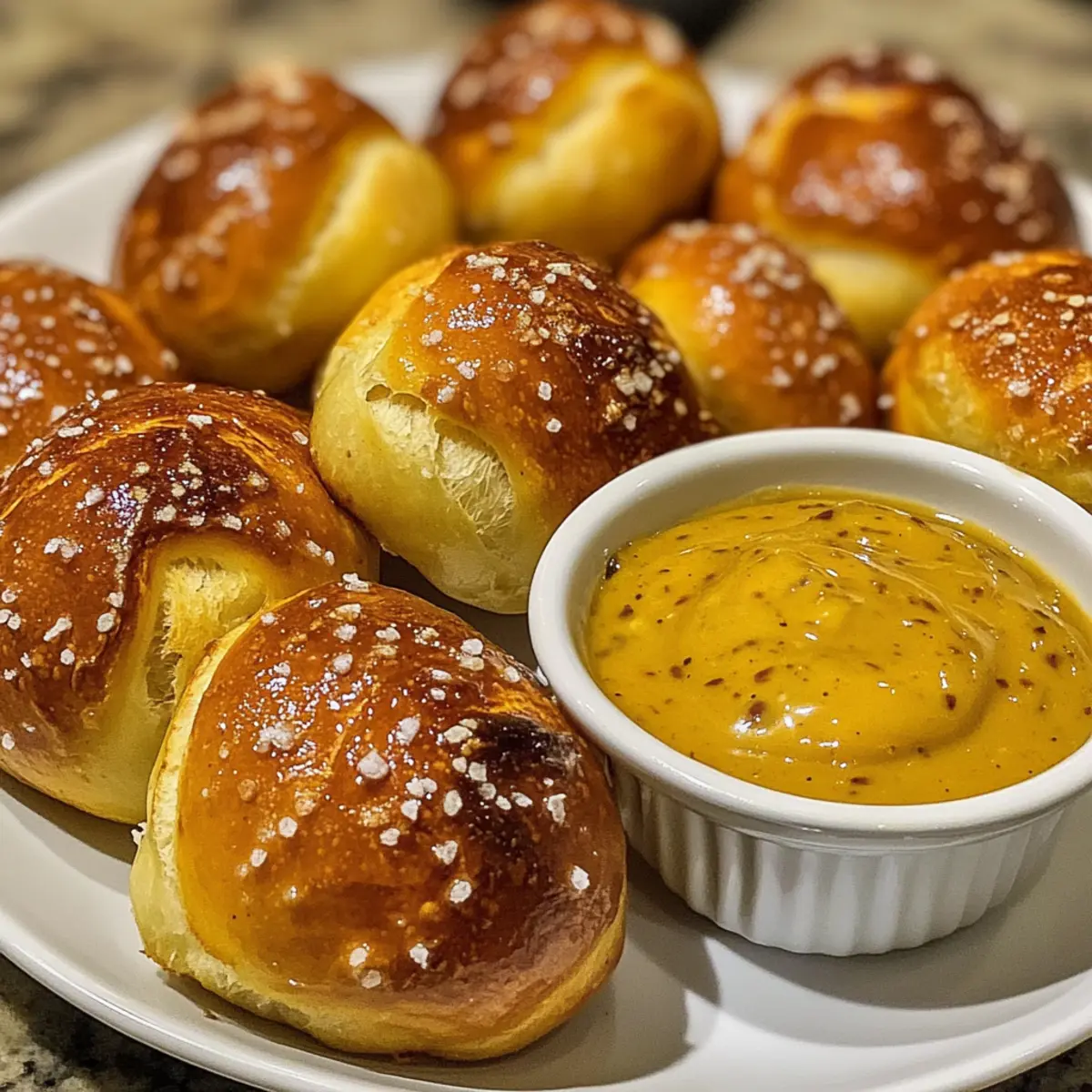 As the rich scent of warm dough fills my kitchen, I’m instantly transported to bustling street fairs, where pretzels are a beloved staple. This recipe for Soft Pretzel Bites brings that joyous experience right to your home, allowing you to craft these pillowy, chewy delights in no time. With simple pantry ingredients, they make for a quick preparation that’s perfect for parties, cozy movie nights, or whenever a snack craving hits. Plus, when paired with a zesty homemade honey mustard dipping sauce, they become an irresistible treat that everyone will love. Curious how to recreate that perfect street-style flavor with just one tender bite? Let’s dive into the process together! Why Are Pretzel Bites So Irresistible? Simplicity, these pretzel bites are made with basic pantry ingredients, meaning you can whip them up anytime. Pillowy texture delivers that perfect bite – chewy on the outside, soft on the inside. Versatility shines here! Toss them in cinnamon sugar for a sweet twist or enjoy them with a zesty homemade honey mustard sauce. Crowd-pleaser status guaranteed; they’re ideal for game nights or casual gatherings, making everyone feel at home. So why not indulge in these delightful snacks and consider serving them alongside other fun treats like Soft Pretzel Dogs or Truffles Coffee Bites for a curated snacking experience? Pretzel Bites Ingredients • Get ready to create these delectable bites! For the Dough All-purpose flour – Provides structure and chewiness; bread flour can be used for extra texture. Sugar – Balances flavor and promotes browning; substitute with honey for a natural sweetness. Instant yeast – Helps the dough rise quickly without activation; active dry yeast can also work with blooming. Salt – Enhances flavor and strengthens the dough; fine salt mixes in seamlessly. Warm milk (or water) – Hydrates the dough and activates the yeast; water makes it dairy-free. Melted butter – Adds richness to the flavor; vegetable oil can substitute for a dairy-free option. For the Baking Soda Bath Water – Creates the essential baking soda bath for that chewy pretzel skin. Baking soda – Contributes to the signature flavor and golden color of your pretzel bites. For the Egg Wash Large egg (mixed with water) – Provides a glossy finish when brushed on; plant-based milk is perfect for a vegan version. Enjoy making these delightful pretzel bites for your next gathering! Step‑by‑Step Instructions for Pillowy Soft Pretzel Bites Step 1: Mixing the Dough In a stand mixer, combine 4 cups of all-purpose flour, 1 tablespoon of sugar, and 2 teaspoons of instant yeast. Gradually add 1½ cups of warm milk and 4 tablespoons of melted butter while mixing on low speed. Continue mixing for about 4-5 minutes until the dough is smooth and slightly sticky. If necessary, adjust with a little more flour or milk to achieve the right consistency. Step 2: Letting the Dough Rise Transfer the dough into a greased bowl, cover with a clean kitchen towel, and place it in a warm spot. Allow the dough to rise until it has doubled in size, which should take about 30-60 minutes. You’ll know it’s ready when it feels puffy to the touch and has grown significantly larger. This step is crucial for achieving those soft, pillowy pretzel bites. Step 3: Preparing the Baking Soda Bath While the dough rises, preheat your oven to 450°F (232°C) and line two baking sheets with parchment paper. In a large pot, bring 10 cups of water to a boil and add 2/3 cup of baking soda carefully, as it will bubble up. This bath is essential for creating the characteristic chewy exterior, so let it simmer gently while the dough finishes rising. Step 4: Shaping the Pretzel Bites Once the dough has risen, punch it down to release the air and divide it into 12 equal pieces. Roll each piece into a ¾-inch thick rope and cut them into bite-sized pieces, about 1-2 inches long. The dough should feel soft and elastic. Place the shaped bites on a lightly floured surface while you prepare to boil them, ensuring they don’t stick together. Step 5: Boiling the Pretzel Bites Carefully drop the dough pieces into the boiling baking soda bath, in batches, and let them boil for 30 seconds. This step is what gives pretzel bites their distinctive flavor and texture, so be sure to time it well. Using a slotted spatula, remove the bites from the bath and place them on the prepared baking sheets, spacing them apart for even baking. Step 6: Finishing Touches Before Baking In a small bowl, whisk together a large egg with a tablespoon of water to create an egg wash. Brush the egg wash over each pretzel bite, ensuring an even coating for a beautiful, glossy finish. Sprinkle coarse salt on top for that classic pretzel flavor. This step helps develop a mouthwatering crust as they bake. Step 7: Baking the Pretzel Bites Place the baking sheets in the preheated oven and bake for 12-14 minutes, or until the pretzel bites are golden brown and puffed up. Keep an eye on them, as the perfect timing will yield that delightful golden hue. Once baked, remove them from the oven and let them cool slightly before serving, giving you a decadent snack perfect for sharing. Storage Tips for Pretzel Bites Room Temperature: Store pretzel bites in an airtight container for up to 2-3 days to maintain their chewiness and flavor. Fridge: If you want to extend their freshness, keep them refrigerated for up to a week. Just be sure to reheat before serving! Freezer: For longer storage, freeze pretzel bites in a single layer on a baking sheet, then transfer to a freezer bag for up to 3 months. Reheating: To enjoy your pretzel bites again, reheat in the oven at 350°F for about 5-7 minutes, or microwave for about 20 seconds, until warmed through. Expert Tips for Pretzel Bites Dough Consistency: Keep the dough slightly sticky but manageable; if it feels too dry, add a touch more warm milk or flour to adjust. Boiling Importance: Do not skip the boiling step in the baki