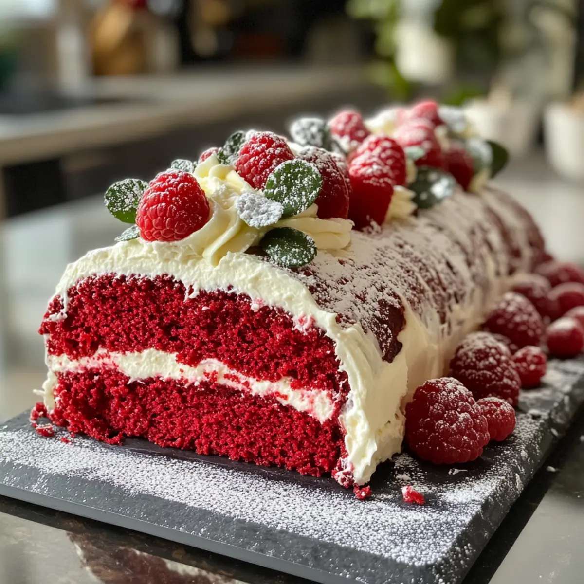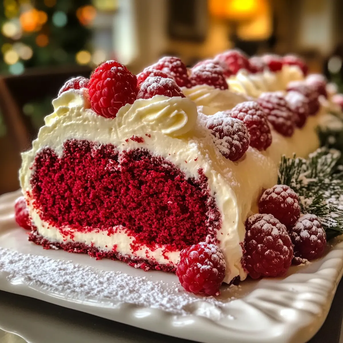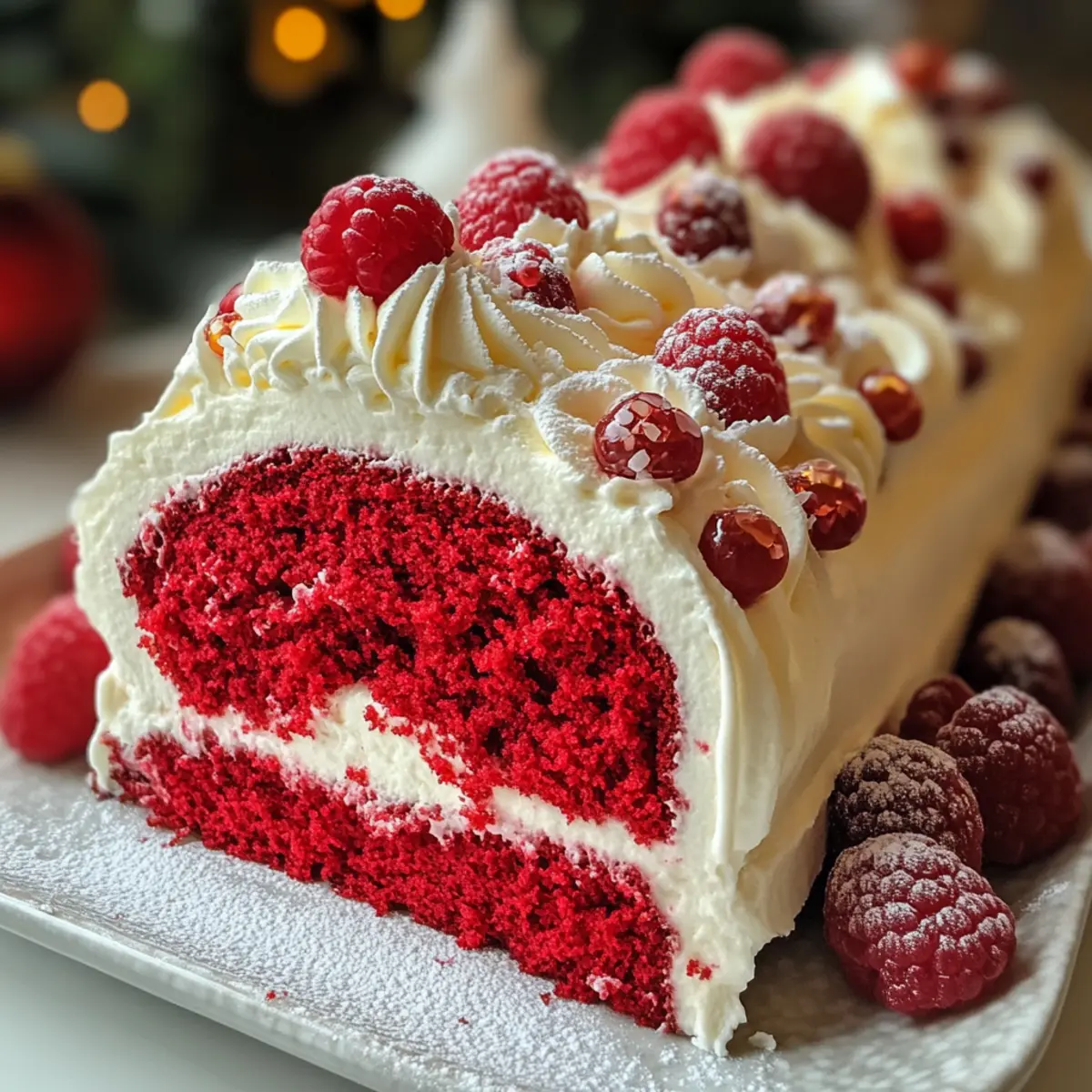 The clink of mugs fills the air as holiday cheer dances around the room, and what’s better to top off a festive gathering than a captivating Red Velvet Yule Log? This showstopper isn’t just a treat for the eyes with its stunning red hue; it also boasts a moist, rich sponge complemented by a smooth, tangy cream cheese filling. Perfect for impressing family and friends, this vegetarian holiday dessert offers both a nostalgic flavor and a touch of whimsy. In just a few hours, you can create a holiday centerpiece that not only delights the palate but also sparks joy in every bite. Ready to roll up your sleeves and craft this delightful dessert? Let’s dive into the steps to make your very own Festive Red Velvet Yule Log! Why is this Yule Log a must-try? Stunning Presentation: The vibrant red hue makes this Yule Log an eye-catching centerpiece that will have everyone talking. Delightful Flavor: With a rich sponge and creamy, tangy filling, it delivers a balance of sweetness and zest that’s simply irresistible. Simple Process: Don’t worry if you’re not a pro baker; this recipe is easy to follow, making it perfect for anyone wanting to impress during the holidays. Vegetarian Friendly: This dessert caters to various dietary preferences, ensuring everyone can enjoy a slice. Versatile Inspiration: Add your twist with garnishes like sugared cranberries or nuts for a personal touch! For even more festive ideas, check out my Red Velvet Cupcakes or Stuffed Red Velvet Cookies to expand your holiday baking repertoire. Red Velvet Yule Log Ingredients For the Sponge • Eggs – Essential for structure and moisture; consider egg replacers for a vegan version. • Egg Yolks – Adds depth of flavor and tenderness to the cake. • Sugar – Sweetens the sponge while aiding in caramelization for that lovely crust. • Type 00 Flour – Creates a delicate texture; you can substitute with all-purpose flour if needed. • Vanilla Bean – Infuses wonderful flavor; vanilla extract is a great shortcut if you’re in a pinch. • Unsweetened Cocoa Powder – Provides a mild chocolate flavor and enhances the red hue. • Food Coloring (red) – Vital for that classic, vibrant look; feel free to skip for a chocolate version. For the Filling • Cream Cheese – Forms the foundation of the filling with a lovely tang; you could try mascarpone for a different texture. • Heavy Cream – Makes the filling light and creamy, elevating the overall dessert. • Wildflower Honey – Adds sweetness and unique floral notes; maple syrup can serve as a delightful alternative. For Decoration • Butter (for decoration) – Crucial for creating a rich buttercream; make sure it’s cold for optimal whipping. • Sambuca – Lends a unique flavor to the buttercream; you can swap it with vanilla extract if preferred. • Raspberries and Star Anise – Perfect for decoration, giving the cake a festive touch; sugared cranberries work beautifully too. • Powdered Sugar – Sweetens the buttercream and works wonders for dusting on top. With these ingredients, making your Red Velvet Yule Log will be as satisfying as sharing it! Step‑by‑Step Instructions for Red Velvet Yule Log Step 1: Prepare the Cake Batter Begin by preheating your oven to 374°F (190°C). In a large mixing bowl, whip the whole eggs, egg yolks, sugar, and vanilla seeds using a hand mixer until the mixture becomes pale and fluffy, about 5 minutes. Gradually add the red food coloring, mixing until you achieve your desired shade, which should be vibrant and appealing. Step 2: Combine Dry Ingredients Sift together the Type 00 flour and unsweetened cocoa powder into the egg mixture, gently folding them in with a spatula. Be careful to maintain the airiness of the batter; you want it light and airy for your Red Velvet Yule Log. The batter should be smooth and well-combined without any dry flour pockets. Step 3: Bake Sponge Line a 12×16 inch baking pan with parchment paper, then butter the paper to prevent sticking. Pour the red velvet batter into the prepared pan and spread it evenly using a spatula. Bake in the preheated oven for about 20 minutes or until the edges are set and the center springs back when gently pressed. Step 4: Cool the Cake Once baked, immediately transfer the sponge to a clean sheet of parchment paper, allowing it to cool for about 5 minutes. Carefully peel off the paper from the bottom, then wrap the sponge tightly in the parchment and let it cool completely at room temperature for about 1 hour to prevent drying out. Step 5: Make the Filling In a medium bowl, beat together the cream cheese, wildflower honey, and heavy cream until smooth and creamy. The filling should be light and luscious, making it the perfect complement for your Red Velvet Yule Log. Adjust the sweetness to your taste, ensuring a light tanginess shines through the cream cheese. Step 6: Form the Log Carefully unroll the cooled sponge and trim the edges for a clean finish. Evenly spread the cream cheese filling over the surface of the cake, leaving a small border around the edges. Using the parchment paper for support, roll the sponge tightly into a log shape, making sure not to press too hard to avoid cracking. Refrigerate the rolled log for at least 2 hours to set. Step 7: Prepare the Buttercream In a mixing bowl, whip cold butter with powdered sugar until light and fluffy. This may take around 5 minutes. Gradually add the Sambuca while mixing to achieve a smooth consistency. Your buttercream should be rich and creamy, perfect for coating the outer layer of your Red Velvet Yule Log. Step 8: Decorate Once the Yule Log is chilled, carefully unwrap it and apply a thin layer of buttercream over the entire log using a spatula. Create a bark-like texture by dragging a fork over the buttercream. Finally, decorate your log with fresh raspberries and a dusting of powdered sugar, adding that festive, holiday touch that will delight everyone. What to Serve with Festive Red Velvet 