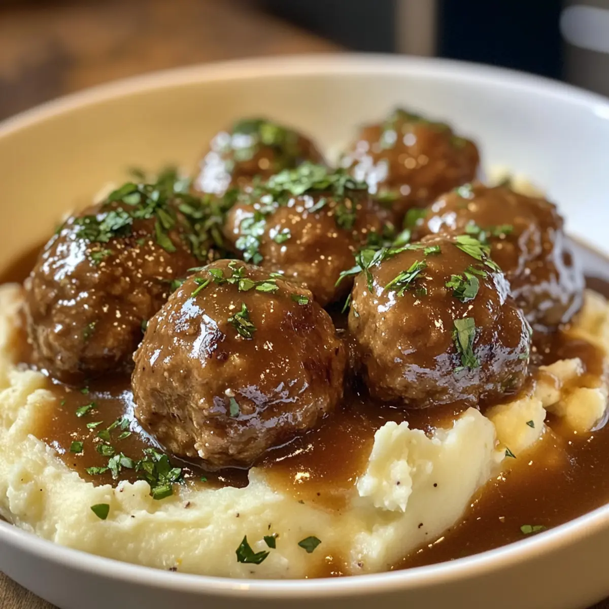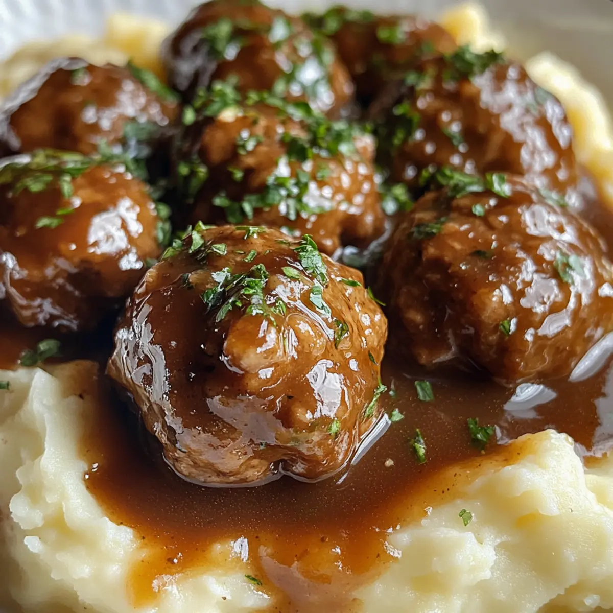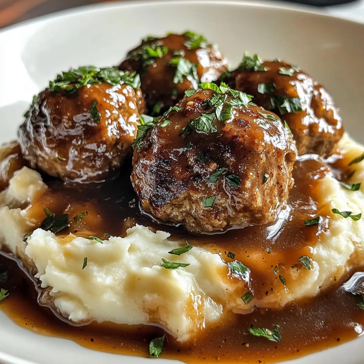 There’s something undeniably heartwarming about the aroma of Salisbury Steak Meatballs wafting through your kitchen. This dish captures the essence of home-cooked comfort food, bringing together succulent meatballs and silky gravy in a way that feels like a warm embrace. Paired with creamy garlic herb mashed potatoes, this meal is not just about satisfaction; it’s all about creating cherished memories around the dinner table. The Salisbury Steak Meatballs with Garlic Herb Mashed Potatoes offer a delightful balance of flavors and textures, making them a vibrant crowd-pleaser that’s surprisingly easy to whip up on a busy weeknight. Plus, they can effortlessly cater to gluten-free diets with a few simple swaps! Are you ready to dive into the comforting world of this delicious recipe? Let’s roll up our sleeves and get cooking! Why is this dish a crowd favorite? Comforting, Classic Flavors: The Salisbury Steak Meatballs evoke nostalgia, combining savory beef with rich gravy that warms the heart. Easy Prep: With straightforward steps and common ingredients, you can whip this dish together even on hectic nights. Versatile Options: Feel free to swap in ground turkey or use gluten-free breadcrumbs to fit your dietary needs, ensuring everyone can enjoy it. Irresistible Pairing: The creamy garlic herb mashed potatoes elevate the meal’s comfort factor, perfectly absorbing the flavors of the gravy. Family Appeal: Adults and kids alike will adore this dish, making it an excellent choice for family dinners or gatherings. Salisbury Steak Meatballs Ingredients For the Meatballs Ground Beef – The key protein for juicy meatballs; substitute with ground turkey or chicken for a lighter option. Breadcrumbs – Provides structure and moisture; use gluten-free breadcrumbs for a gluten-free variant. Egg – Binds the ingredients together to ensure the meatballs hold shape, with no substitution required. Onion – Adds sweetness and depth; shallots can be used for a milder taste. Garlic – Infuses cooking with aromatic warmth; adjust quantity based on your personal taste preference. Worcestershire Sauce – Adds umami complexity and tang; soy sauce can be used as a substitute for a similar flavor. Salt and Black Pepper – Essential for seasoning; kosher salt can provide better flavor control. Dried Thyme – Offers earthy notes that complement beef; fresh thyme can be swapped in for a more robust flavor. For the Gravy Olive Oil – Used for sautéing onions and garlic; adds a mellow fruitiness, or substitute with any neutral oil. Beef Broth – Forms the base for the gravy, enriching the flavor profile; vegetable broth can lighten the dish. Cornstarch – Thickens gravy to a luscious consistency; consider using instant flour as an alternative. For the Mashed Potatoes Potatoes (Yukon Gold) – Known for their creamy consistency when cooked; Russet potatoes can serve as a substitute. Butter – Adds creaminess and flavor; for a healthier version, use olive oil or a dairy-free alternative. Milk – Enriches potatoes for a smooth texture; feel free to use non-dairy milk options. Fresh Parsley – Adds a bright finishing touch; substitute with fresh chives for a different herbal note. Indulge in these Salisbury Steak Meatballs with Garlic Herb Mashed Potatoes, perfect for delicious family dinners! Step‑by‑Step Instructions for Salisbury Steak Meatballs with Garlic Herb Mashed Potatoes Step 1: Preheat and Prepare the Meatball Mixture Begin by preheating your oven to 400°F (200°C). In a large mixing bowl, combine the ground beef, breadcrumbs, egg, finely chopped onion, minced garlic, Worcestershire sauce, salt, black pepper, and dried thyme. Use your hands to gently mix the ingredients until just combined—overmixing can result in tough meatballs. Step 2: Form and Bake the Meatballs With the meat mixture ready, start shaping it into 1-inch meatballs. Place them neatly on a parchment-lined baking sheet, ensuring they have a bit of space between them. Bake in the preheated oven for about 20 minutes or until they are browned and cooked through, with an internal temperature of 160°F (70°C). Step 3: Sauté Onions and Garlic for the Gravy While the meatballs are baking, heat 1 tablespoon of olive oil in a large skillet over medium heat. Add diced onion and minced garlic, sautéing them for about 3-5 minutes until the onion turns translucent and fragrant. Stir occasionally to prevent burning; this aromatics mix will form the flavorful base of your gravy. Step 4: Build the Gravy Once the onions and garlic are ready, pour in 2 cups of beef broth and a splash of Worcestershire sauce, stirring to combine. Bring the mixture to a gentle simmer and let it cook for about 5 minutes. This allows the flavors to meld beautifully, enriching the gravy that will coat the Salisbury Steak Meatballs. Step 5: Thicken the Gravy To create a luscious gravy, prepare a cornstarch slurry by mixing 1 tablespoon of cornstarch with a few tablespoons of cold water in a small bowl. Slowly whisk the slurry into the simmering gravy while continuously stirring. Allow the gravy to simmer for another 2-3 minutes, until it thickens to your desired consistency. Adjust the seasoning with salt and pepper as needed. Step 6: Boil and Mash the Potatoes As the gravy simmers, peel and chop 2 pounds of Yukon Gold potatoes into even chunks. Place them in a pot, cover with water, and add a pinch of salt. Bring to a boil and cook for about 15-18 minutes or until the potatoes are fork-tender. Drain well and return the potatoes to the pot to begin mashing. Step 7: Make the Garlic Herb Mashed Potatoes In the drained pot, add 1/2 cup of milk, 1/4 cup of butter, salt, and pepper to taste. Mash the ingredients together until smooth and creamy, then stir in freshly chopped parsley for an aromatic burst. This creamy garlic herb mashed potato will beautifully balance the savory flavors of the Salisbury Steak Meatballs. Step 8: Combine Meatballs with Gravy Once