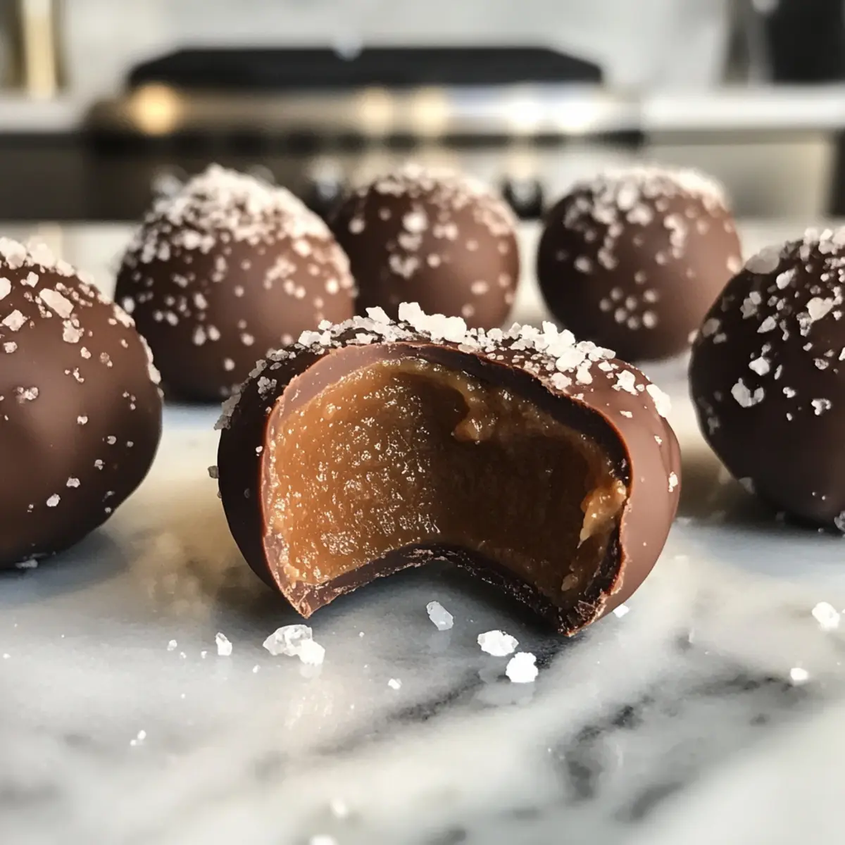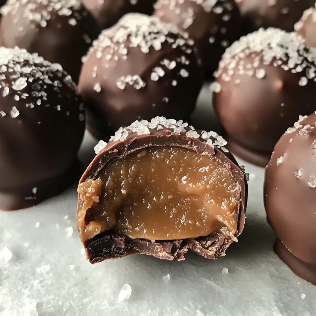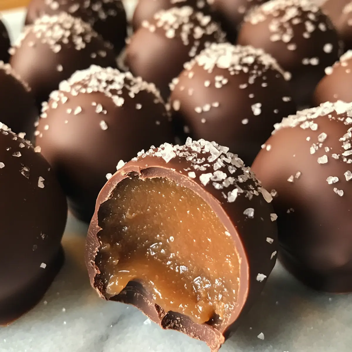 As I stood by the kitchen counter, the sweet aroma of melting chocolate wafted through the air, making every ounce of my stress fade away. I was about to embark on a delightful adventure with Easy No-Bake Salted Caramel Truffles, which promised to tantalize my taste buds and elevate any gathering. These truffles are not only a joy to make but also a total crowd-pleaser, requiring minimal prep and zero baking! The blend of salty and sweet creates a taste sensation that’s simply irresistible. Plus, the best part? They’re fully customizable—swap out ingredients or add your favorite toppings to make them truly your own. Ready to transform your dessert game? Let’s dive into this quick and delicious recipe! Why are Salted Caramel Truffles a Must-Try? Indulgence awaits! These Easy No-Bake Salted Caramel Truffles are a luscious treat that combines simplicity with gourmet flair. Versatile and customizable, feel free to swap white chocolate for milk or add a sprinkle of crushed nuts on top. Quick to prepare, they come together in under an hour, making them perfect for last-minute gatherings. Melt-in-your-mouth texture will have your friends and family reaching for more. And if you’re loving these sweet delights, don’t miss out on the indulgence of Tiramisu Truffles Coffee or the burst of flavor from Chocolate Raspberry Truffles! Salted Caramel Truffles Ingredients For the Truffle Mixture • Sweetened Condensed Milk – Acts as the base and source of creaminess in the truffles. Substitution: None recommended. • Salted Caramel Sauce – Provides richness and a sweet-salty balance. Substitution: Homemade caramel can be used; adjust salt accordingly. • White Chocolate Chips – Adds sweetness and creamy texture. Substitution: Milk chocolate can be used for a different flavor. • Sea Salt – Enhances flavor and provides a contrasting taste to the sweetness. Substitution: Flaked sea salt is preferred, but kosher salt can work. For the Coating • Dark or Milk Chocolate (for coating) – Provides a rich outer layer. Substitution: Use any chocolate type as preferred for coating. Optional Toppings • Crushed Nuts – Adds a delightful crunch and flavor variations. Substitution: Customize toppings according to preference. • Cocoa Powder – For a rich, chocolatey finish that elevates the truffles. Step‑by‑Step Instructions for Easy No-Bake Salted Caramel Truffles Step 1: Prepare the Mixture In a microwave-safe bowl, combine the sweetened condensed milk, salted caramel sauce, and white chocolate chips. Microwave the mixture in 30-second intervals, stirring gently between each until it’s completely melted and smooth, which should take about 1-2 minutes total. The smooth, glossy texture indicates you’re ready for the next step. Step 2: Add Sea Salt and Chill Once the chocolate mixture is velvety, stir in a pinch of sea salt for that perfect salty-sweet balance. Transfer this creamy concoction into a lined baking dish, spreading it evenly. Cover it with plastic wrap and chill in the refrigerator for 3-4 hours or until it becomes firm and easy to scoop, achieving a solid state that holds its shape. Step 3: Form the Truffles After the mixture has chilled sufficiently, remove it from the refrigerator. Use a small cookie scoop or your hands to scoop out portions of the truffle mixture, rolling them into smooth balls about 1 inch in diameter. As you shape the Easy No-Bake Salted Caramel Truffles, the warmth of your hands will help create a perfect, glossy exterior. Step 4: Melt the Coating Chocolate Next, prepare to coat your truffles. In a microwave-safe bowl or using a double boiler, melt your choice of dark or milk chocolate until it’s fully liquefied. Stir often and do this slowly to avoid scorching, as 1-2 minutes in the microwave should be enough for a silky consistency, perfect for a luscious coating. Step 5: Coat the Truffles Dip each truffle ball into the melted chocolate, ensuring it’s completely covered. Use a fork to lift it out and allow excess chocolate to drip off before placing it on a parchment-lined baking sheet. For an extra touch, sprinkle a bit of sea salt on top of each truffle while the chocolate is still wet, enhancing the salted caramel flavor. Step 6: Let the Truffles Set Finally, allow the coated truffles to set at room temperature or refrigerate them for about 30 minutes until the chocolate shell is firm. The glossy chocolate coating will create a delicious contrast against the creamy interior, completing your homemade Easy No-Bake Salted Caramel Truffles and making them ready for sharing! What to Serve with Easy No-Bake Salted Caramel Truffles? Indulge in a delicious experience by crafting the perfect pairing to complement your delightful truffles, elevating your dessert game to the next level. Fresh Berries: The tartness of strawberries or raspberries perfectly contrasts the rich sweetness, adding a refreshing touch. Vanilla Ice Cream: A scoop of creamy vanilla ice cream alongside the truffles amplifies the decadent flavor and creates a delightful melt-in-your-mouth moment. Espresso or Coffee: The bold richness of coffee enhances the sweet notes of the truffles, making it an ideal pairing for those who crave a little caffeine kick. Chocolate Fondue: Serve a bowl of warm chocolate fondue where guests can dip the truffles for an interactive and indulgent dessert experience. Charming Dessert Platter: Arrange truffles with assorted mini pastries and cookies for an elegant dessert spread that dazzles at gatherings, inviting everyone to indulge. Spiced Chai Tea: A warm cup of spiced chai tea offers a comforting warmth, harmonizing beautifully with the sweet and salty nuances of the truffles. Feel free to mix and match these delightful additions, enhancing your celebration or cozy evening with the unmistakable allure of Salted Caramel Truffles! Make Ahead Options These Easy No-Bake Salted Caramel Truffles are ideal for busy home cooks looking to save time with
