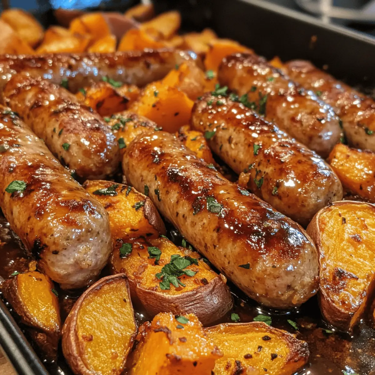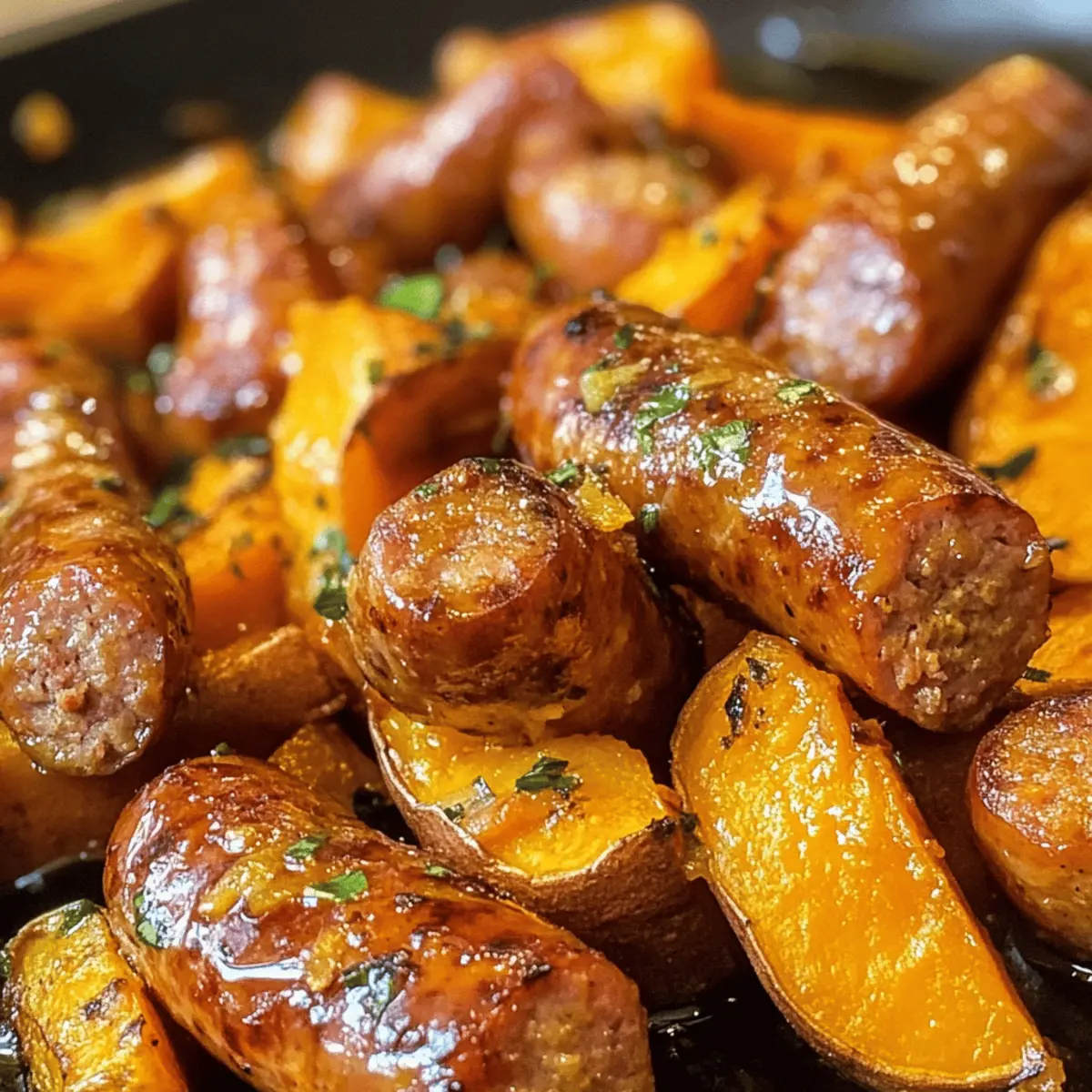 As I pulled the warm, glossy tray from the oven, the sweet aroma of roasted sweet potatoes and smoky sausage enveloped my kitchen like a cozy embrace. Let me introduce you to my Quick Sausage and Sweet Potatoes with Honey Garlic Sauce, a dish that deftly balances hearty flavor and stunning ease. Ideal for busy weeknights, this gluten-free sensation can be on your table in just 55 minutes, giving you more time to unwind and enjoy dinner with loved ones. Each bite offers a delightful mix of tender sweet potatoes and juicy sausage, all wrapped in a sticky glaze that’s simply irresistible. With endless variations waiting to be explored, what twist will you add to make it your own? Why is this recipe a weeknight winner? Simplicity: With just a handful of ingredients, this dish is made for those busy evenings when you crave home-cooked goodness without the fuss. Versatility: Easily swap in different types of sausage or add extra veggies like Brussels sprouts to customize your meal. Crowd-Pleaser: The sweet and savory flavors come together to please even the pickiest eaters, making it perfect for families. Quick Prep: In just 55 minutes, you can serve a stunning dish that looks as good as it tastes. Flavorful Glaze: The honey garlic sauce elevates the dish with a sticky sweetness that keeps everyone coming back for more. For more delicious comfort food ideas, try my Garlic Shrimp Mashed or Sweet Honey Glazed recipes! Sausage and Sweet Potatoes with Honey Garlic Sauce Ingredients For the Roasted Base Sweet Potatoes – Main ingredient providing natural sweetness; butternut squash is a tasty alternative. Sausage – Essential for protein and savory flavor; choose from chicken, turkey, or pork based on your preference. Olive Oil – Enhances flavor and browning; avocado oil is a great substitute for higher heat cooking. Salt & Pepper – Key seasonings for enhancing taste; adjust them according to your dietary needs. For the Honey Garlic Sauce Honey – Adds sweetness and creates a sticky glaze; agave syrup can be used for a vegan-friendly option. Minced Garlic – Brings a delightful punch of flavor; fresh garlic yields the best results. Soy Sauce – Contributes umami depth to the glaze; opt for gluten-free soy sauce to keep the dish gluten-free. With these simple ingredients, you’ll be well on your way to creating the delicious Sausage and Sweet Potatoes with Honey Garlic Sauce! Step‑by‑Step Instructions for Sausage and Sweet Potatoes with Honey Garlic Sauce Step 1: Preheat the Oven Begin by preheating your oven to 400°F (200°C). This temperature ensures the sweet potatoes roast evenly, becoming beautifully tender and slightly caramelized. While the oven heats up, you can prepare the sweet potatoes and sausage, making your cooking process efficient and seamless. Step 2: Prepare the Sweet Potatoes Peel and cube the sweet potatoes into uniform pieces to ensure even cooking. In a large mixing bowl, toss the cubes with olive oil, salt, and pepper, allowing them to be well-coated. You’ll want these vibrant pieces to glisten with oil, setting the stage for a sweet and savory base in your Sausage and Sweet Potatoes with Honey Garlic Sauce. Step 3: Roast the Sweet Potatoes Spread the sweet potato cubes in a single layer on a baking sheet lined with parchment paper. Roast them in the preheated oven for 20 minutes, checking halfway through; they should be fork-tender with golden edges when done. The aroma will start to fill your kitchen, hinting at the deliciousness to come. Step 4: Make the Honey Garlic Sauce While the sweet potatoes are roasting, whisk together honey, minced garlic, and soy sauce in a small bowl. The mixture should become well-combined, resembling a glossy sauce that will coat your ingredients beautifully. This delectable glaze will add a mouthwatering sweetness to the sausage and sweet potatoes. Step 5: Combine Sausage and Sauce After 20 minutes, take the sweet potatoes out of the oven and add your choice of sausage to the baking sheet. Drizzle the honey garlic sauce over the sweet potatoes and sausage, making sure everything is evenly coated. Toss gently with a spatula, mixing the flavors and ensuring that the beautiful glaze clings to each piece. Step 6: Roast Again Return the baking sheet to the oven and roast for an additional 15-20 minutes. Keep an eye on the dish; you want the sausage to be cooked through and nicely browned, while the sweet potatoes should remain tender. The combination of sizzling sausage and caramelized sweet potatoes will create an irresistible aroma. Step 7: Serve and Enjoy Once your Sausage and Sweet Potatoes with Honey Garlic Sauce is beautifully roasted and fragrant, take it out of the oven. Allow it to cool for a few minutes before serving. This dish looks vibrant and inviting, perfect for a cozy family dinner or a casual gathering with friends. Make Ahead Options Preparing my Sausage and Sweet Potatoes with Honey Garlic Sauce ahead of time is an excellent strategy for busy weeknights! You can chop the sweet potatoes and store them in an airtight container in the refrigerator for up to 3 days. This ensures they stay fresh and reduces your evening prep time. Alternatively, you can also cook the sausage separately and keep it in the fridge for up to 24 hours. When you’re ready to enjoy this delicious meal, simply roast the sweet potatoes as directed, add the sausage, drizzle with the honey garlic sauce, and finish roasting for 15-20 minutes for that same comforting flavor—just as inviting and satisfying as if it were freshly made! What to Serve with Sausage and Sweet Potatoes with Honey Garlic Sauce Creating a delightful meal is all about harmony on the plate. Let’s explore the perfect complements to elevate your dinner experience! Crispy Green Salad: A fresh mix of greens with a zesty vinaigrette adds a crunchy contrast, balancing the dish’s sweetness beautifully. Steamed Asparagus: The tender yet firm texture of steamed asparagus pair