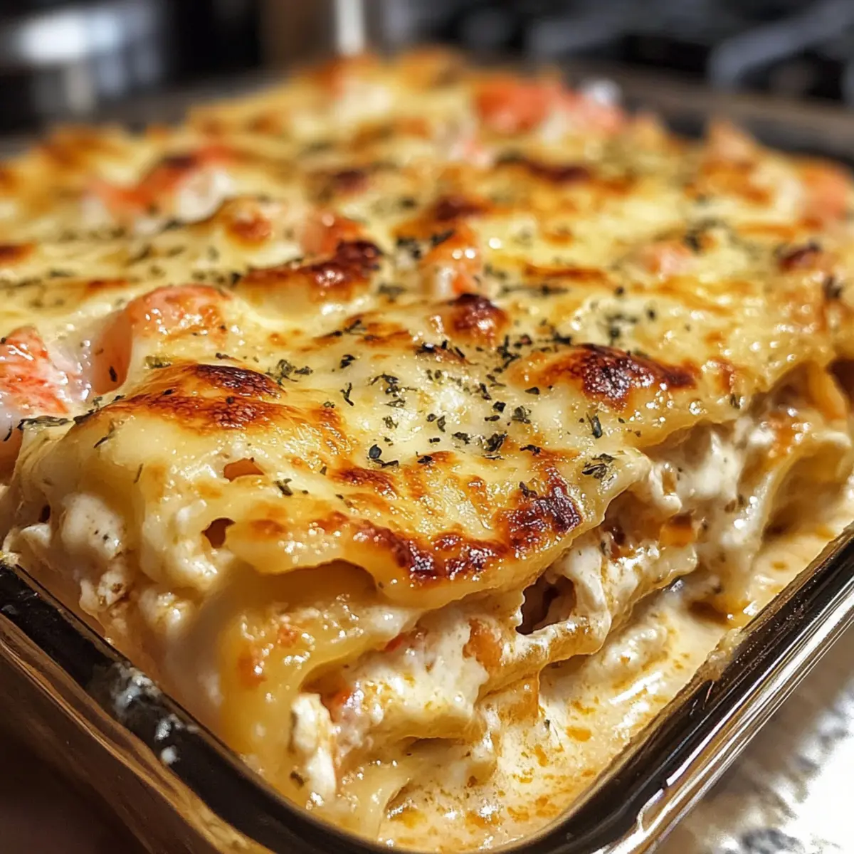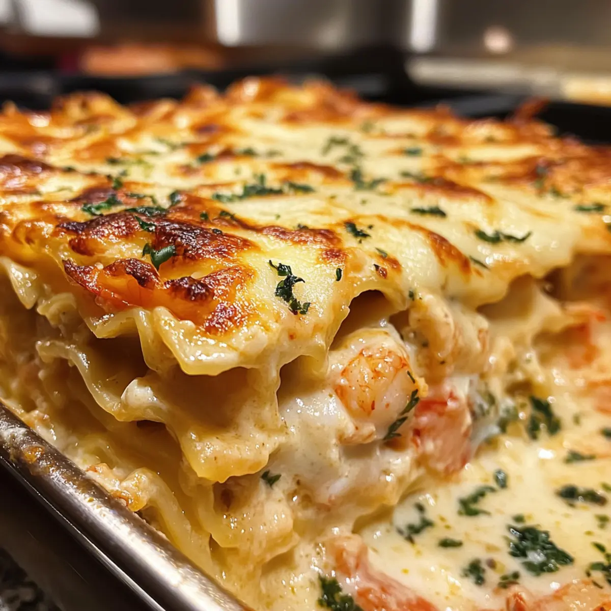 Indulgent Layers: This seafood lasagna is a showstopper, masterfully combining tender lobster and shrimp in every creamy bite.