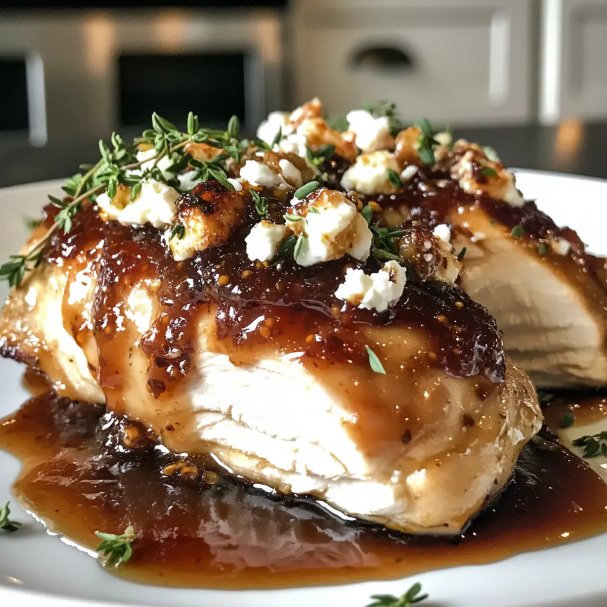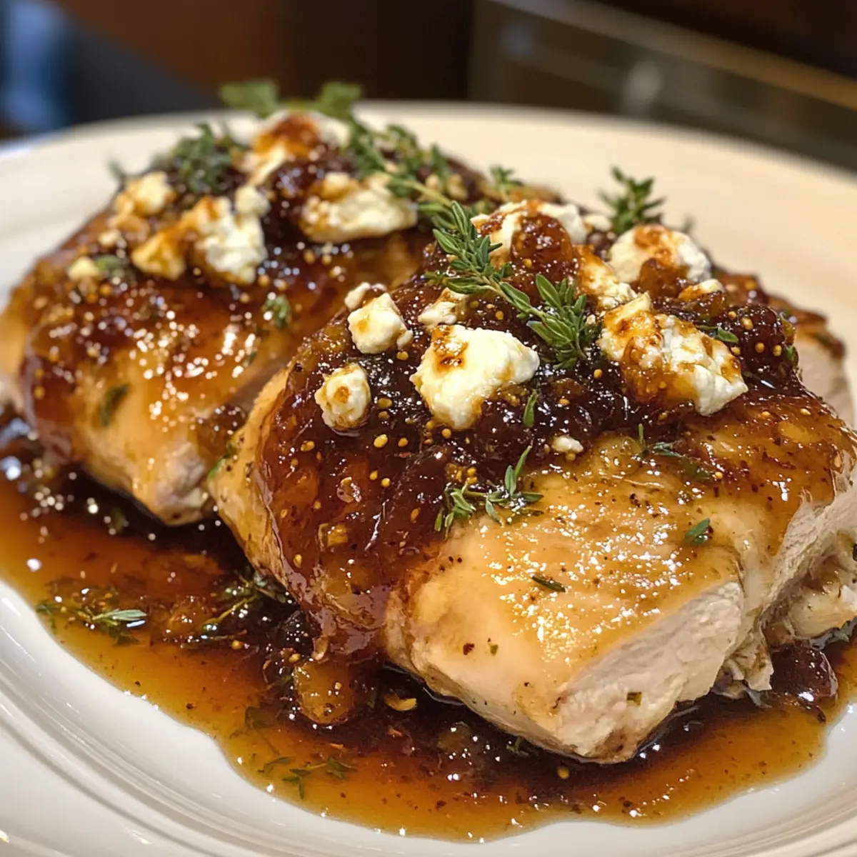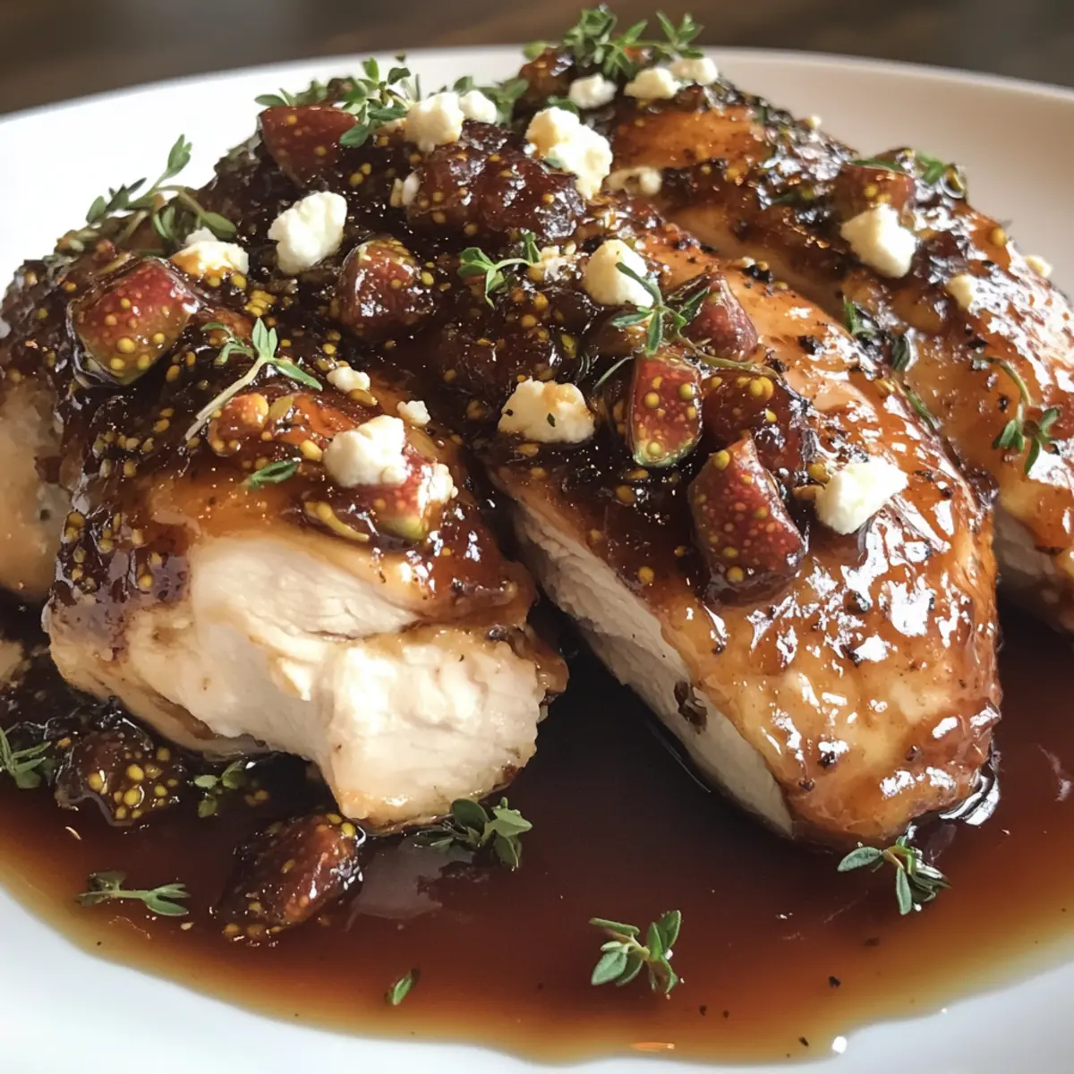 7. Once done, serve the chicken with the fig sauce drizzled over and garnish with thyme.