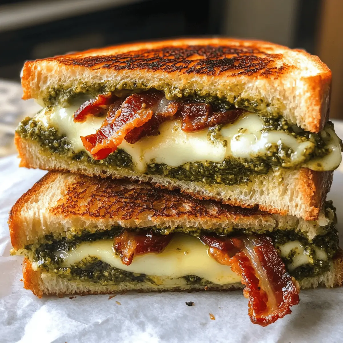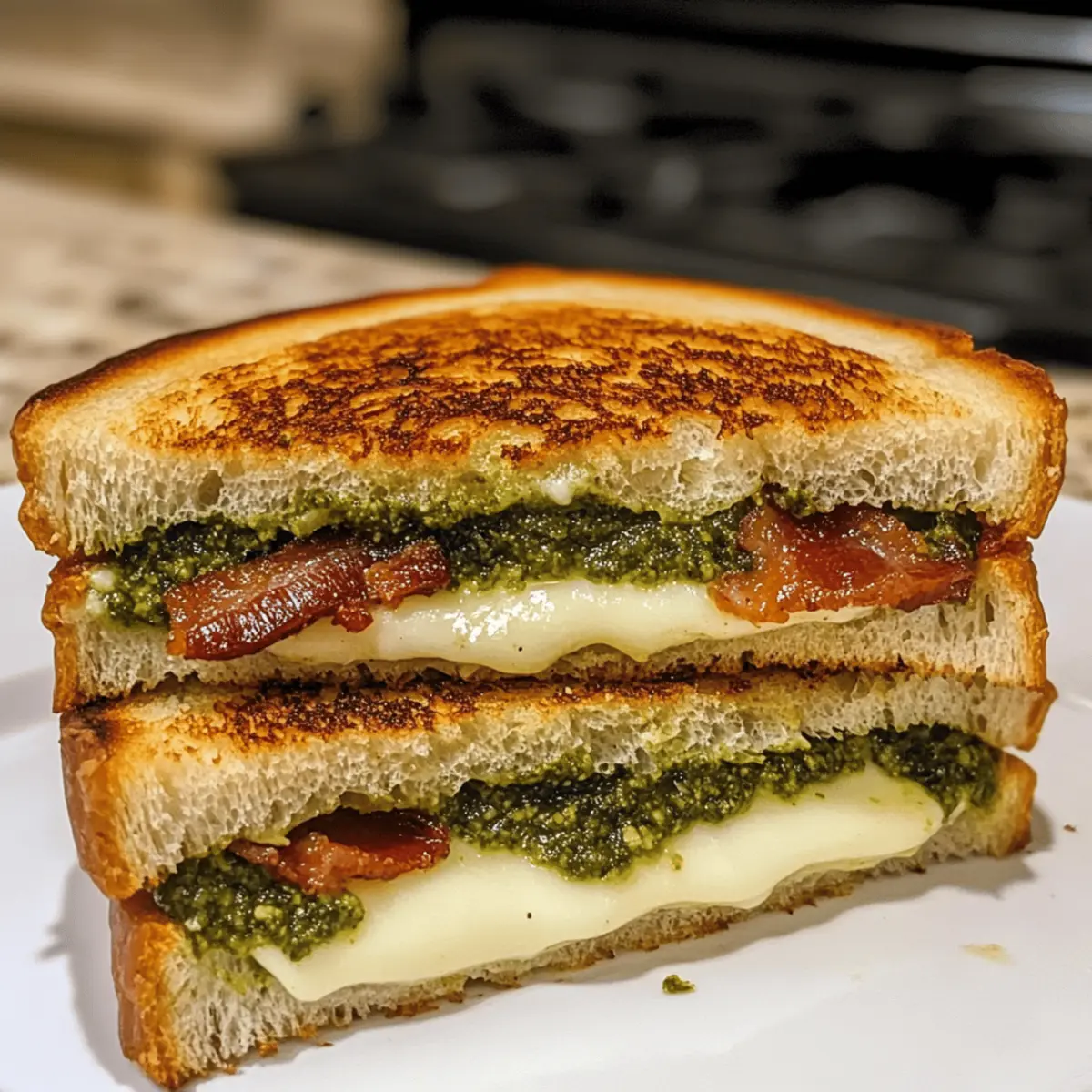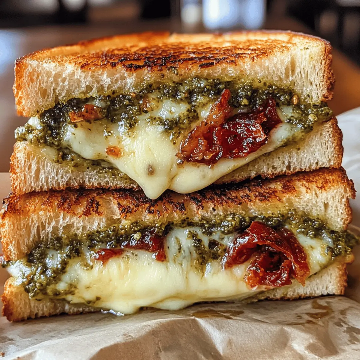 While flipping through a stack of recipe cards, I stumbled upon a gem that caught my eye—Sourdough Pesto Grilled Cheese with Bacon and Sun-Dried Tomatoes. Just the thought of creamy mozzarella melting into a savory basil pesto, all sandwiched between crispy, golden-brown sourdough slices, had my stomach rumbling with anticipation. This undeniably comforting dish is not only a quick meal solution for busy days but also a customizable delight that caters to your taste buds. Whether you choose to elevate it with irresistible bacon or keep it simple, this recipe transforms a classic grilled cheese into a gourmet masterpiece. Are you ready to explore this scrumptious twist on a beloved favorite? Why is this grilled cheese so special? Simplicity at Its Best: This Sourdough Pesto Grilled Cheese combines basic pantry ingredients for effortless preparation, making it perfect for any casual lunch or dinner. Irresistible Flavor: The blend of gooey mozzarella, fragrant basil pesto, and optional crispy bacon creates a burst of savory goodness that elevates this sandwich above the ordinary. Customizable Delight: Feel free to swap in fresh tomatoes or include roasted red peppers to suit your flavor preferences! Quick Meal Solution: Ready in just minutes, this recipe is a fantastic way to satisfy your cravings without long cooking times. Ultimate Crowd-Pleaser: Whether serving family or entertaining guests, everyone will rave about this gourmet twist on the classic grilled cheese. Need other pairing ideas? Try some Mini Rolo Cheesecakes for dessert or a refreshing arugula salad on the side! Sourdough Pesto Grilled Cheese Ingredients For the Sandwich • Sourdough Bread – Choose thickly sliced, fresh sourdough (about ½ inch) for the best texture; avoid overly sour or airy loaves. • Mozzarella Cheese – Use fresh mozzarella, and pat dry to minimize moisture; low-moisture mozzarella is an option for less sogginess. • Basil Pesto – Homemade or store-bought, use it sparingly to prevent sogginess in your Sourdough Pesto Grilled Cheese. • Sun-Dried Tomatoes – Adds a tangy note and texture; can be substituted with fresh tomatoes for a lighter option. • Cooked Bacon – Provides added savoriness; can be replaced with turkey bacon for a lighter version, if desired. • Butter – Spread unsalted butter on the bread for frying; avoid melting it in the pan for extra crispiness. Step‑by‑Step Instructions for Sourdough Pesto Grilled Cheese Step 1: Prepare the Bread Begin by taking two thick slices of fresh sourdough bread, about ½ inch each, and spread unsalted butter on one side of each slice. The buttered side will create that golden, crispy exterior. Ensure the slices are thick enough to hold their shape while grilling, avoiding overly airy loaves for the best texture in your Sourdough Pesto Grilled Cheese. Step 2: Layer the Cheese and Pesto In a skillet set over medium-low heat, place one slice of sourdough, butter side down. Layer 3-4 slices of fresh mozzarella cheese on the bread, allowing the cheese to cover the base entirely for even melting. Next, add approximately a tablespoon of basil pesto on top of the mozzarella, spreading it gently to enhance the flavor without saturating the bread. Step 3: Add Optional Ingredients If desired, sprinkle sun-dried tomatoes on top of the pesto for an extra burst of flavor, followed by crispy bacon, laid out evenly. Be cautious not to overcrowd your Sourdough Pesto Grilled Cheese with toppings to prevent spillage. For those seeking a lighter alternative, swap in turkey bacon or fresh tomatoes for a delicious twist. Step 4: Complete the Sandwich Follow up by adding another layer of mozzarella cheese on top of the bacon and tomatoes, sealing in the flavors. Place the second slice of sourdough bread, butter side up, on top to complete your sandwich. This captivating combination will create that gooey goodness when grilled, ensuring that each bite is a delight. Step 5: Warm the Pan Carefully warm the skillet over medium-low heat, allowing the temperature to comfortably melt the cheese without burning your sandwich. Once the pan is heated, gently press down the sandwich with a spatula, ensuring all components meld beautifully. This step is vital to achieving that crisp, golden-brown crust on your Sourdough Pesto Grilled Cheese. Step 6: Grill to Perfection Grill the sandwich for about 3-4 minutes on one side, or until a golden-brown crust forms. Use a spatula to monitor the color, and once it’s beautifully crispy, carefully flip the sandwich over to grill the other side. Maintain that medium-low heat to allow the cheese to melt thoroughly while achieving that perfect crust. Step 7: Check for Doneness After another 3-4 minutes, check if the cheese has melted completely; the sandwich should be a luscious melty masterpiece with a stunning golden-brown exterior. If needed, grill for an additional minute on either side to achieve the perfect doneness. Remove it from the pan, and let it cool slightly before slicing. Step 8: Serve and Enjoy Once cooled, slice your Sourdough Pesto Grilled Cheese in half to reveal the delicious layers inside. Serve warm, paired with a classic tomato soup for the ultimate comfort food experience. The combination of flavors and textures is sure to impress anyone enjoying this delightful gourmet creation! What to Serve with Sourdough Pesto Grilled Cheese Pair your delicious creation with sides and drinks that enhance its rich flavors. Tomato Soup: A classic companion, this comforting soup adds a creamy, tangy contrast to the savory grilled cheese, making every bite even more delightful. Dipping your sandwich into the soup elevates the experience to new heights. Arugula Salad: A refreshing salad dressed with lemon oil provides a bright, peppery bite that beautifully balances the rich, cheesy flavors of the sandwich. The crispness adds a lovely textural contrast. Pickle Spear: A crunchy, tangy pickle adds a zesty tartness that cuts th