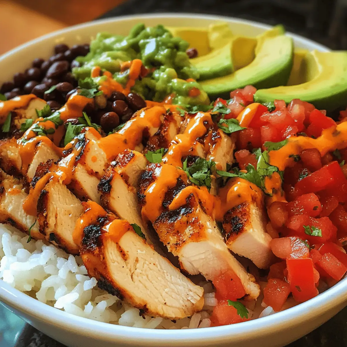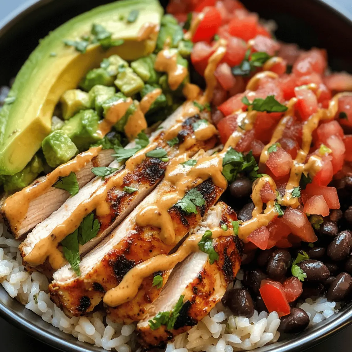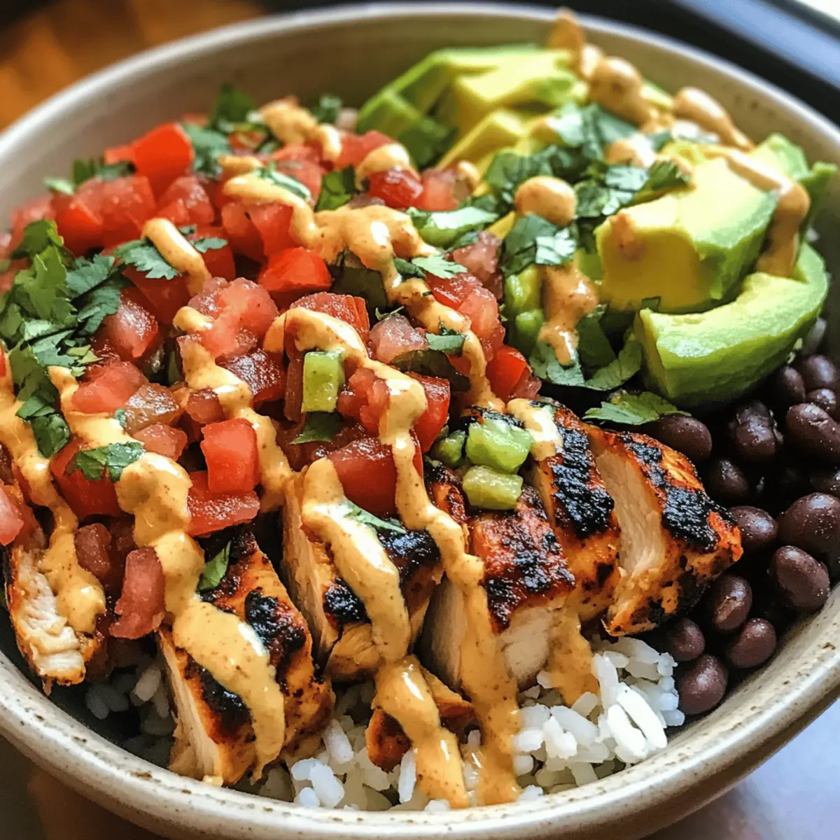 As I chopped the vibrant ingredients for my Southwest Chicken Burrito Bowls, the kitchen filled with the enticing aroma of spices and fresh herbs. This crowd-pleasing recipe brings together juicy, oven-baked chicken, zesty pico de gallo, and warm rice, all topped with a spicy chipotle dressing that elevates it from average to extraordinary. Not only are these burrito bowls a delightful way to enjoy a healthy lunch, but they also make meal prep a breeze, ensuring you always have something delicious waiting in your fridge. Perfect for those busy weekdays or lazy weekends, they’re designed to satisfy your cravings without sacrificing nutrition. Who wouldn’t want a bowl that packs flavor and convenience in every bite? Why are these burrito bowls a must-try? Flavor Explosion: Each bite of these Southwest Chicken Burrito Bowls combines juicy chicken and zesty pico de gallo, drizzled with a spicy chipotle dressing for an unforgettable taste experience. Meal Prep Made Easy: Prep ahead of time, and you’ll have delicious, healthy lunches ready to go, perfect for busy days or surprise guests. Customization Galore: From substituting black beans with lentils to using quinoa or cauliflower rice, you can make this dish your own, catering to various dietary preferences. Crowd-Pleasing Appeal: Whether it’s a family dinner or a gathering with friends, these bowls will impress everyone at the table with their vibrant colors and flavors. Pair them with a refreshing side salad or crunchy tortilla chips for a complete meal experience. If you’re craving something spicy and unique, explore other variations like Buffalo Chicken Taquitos for your next meal! Southwest Chicken Burrito Bowls Ingredients For the Chicken • Boneless, Skinless Chicken Breasts or Thighs – Choose these for a tender, juicy protein that pairs beautifully with the other vibrant flavors. For the Rice Base • Rice – Serves as the comforting base; consider brown rice for added fiber or cauliflower rice for a low-carb alternative. For the Pico de Gallo • Tomatoes – Freshly diced, they bring juiciness and color to your burrito bowls. • Onion – Adds crunch and sharpness; red onion is sweeter for a milder taste. • Cilantro – Enhances the freshness; feel free to skip if you’re not a fan of its flavor. • Lime Juice – Brightens the overall dish; fresh is always better for that zesty kick. • Salt – Improves the flavor profile; adjust to taste. For the Dressing • Chipotle Powder or Sauce – This adds the heat and smokiness; adjust based on your spice tolerance. • Dairy-Free Yogurt – Use this for creaminess and as a substitute for traditional dairy-based dressings. For the Toppings • Black Beans – A protein and fiber powerhouse; swap with lentils if you’re looking to mix things up. • Avocado – Offers creamy texture and healthy fats; guacamole is an excellent alternative. • Cheese Alternatives – Enhances the richness while keeping it dairy-free; try nutritional yeast for a cheesy flavor. • Corn, Cilantro, and Lime Wedges – These brighten and elevate your bowls, adding freshness and crunch. Dive into these Southwest Chicken Burrito Bowls, and you’ll find a perfect balance of flavors and healthy goodness, making meal prep a delightful experience! Step‑by‑Step Instructions for Southwest Chicken Burrito Bowls Step 1: Preheat Oven Begin by preheating your oven to 400°F (200°C). This is the ideal temperature for baking your chicken, ensuring it cooks evenly and comes out tender. While the oven heats, prepare your chicken by seasoning it to enhance the flavor of your Southwest Chicken Burrito Bowls. Step 2: Season Chicken Take the boneless, skinless chicken breasts or thighs and coat them with a mixture of your favorite spices, such as paprika and cumin. Make sure to evenly distribute the spices across the chicken, giving them a vibrant flavor profile. Set aside to let the seasoning infuse while the oven finishes preheating. Step 3: Bake Chicken Once the oven is hot, place the seasoned chicken on a baking sheet lined with parchment paper. Bake for 25-30 minutes or until the chicken reaches an internal temperature of 165°F (75°C) and the juices run clear. The chicken should appear golden brown on the outside and be juicy inside, making it perfect for your burrito bowls. Step 4: Prepare Rice While the chicken bakes, cook your rice according to the package instructions. This usually takes about 15-20 minutes. Once cooked, fluff the rice with a fork and set it aside to cool slightly. This warm, comforting base will complement the other fresh ingredients in your Southwest Chicken Burrito Bowls beautifully. Step 5: Make Pico de Gallo In a mixing bowl, combine diced tomatoes, chopped onion, cilantro, and a splash of lime juice. Season with salt to taste. Allow the pico de gallo to meld together for about 10 minutes, enhancing its flavors. This fresh salsa adds a zesty kick to your bowls, balancing the warmth of the chicken. Step 6: Mix Dressing In a separate bowl, combine chipotle powder or sauce with dairy-free yogurt to create a creamy, tangy dressing. Whisk until smooth and adjust seasoning as needed. This dressing will add a delightful spiciness to your Southwest Chicken Burrito Bowls, elevating the overall flavor and making each bite unforgettable. Step 7: Assemble Bowls To assemble your Southwest Chicken Burrito Bowls, start with a generous scoop of the warm rice as the base. Top it with slices of the baked chicken, a hearty portion of pico de gallo, black beans, and slices of avocado. Finally, drizzle with the chipotle dressing for a complete, mouth-watering meal that’s perfect for meal prep. Make Ahead Options These Zesty Southwest Chicken Burrito Bowls are perfect for meal prep enthusiasts! You can prepare the chicken up to 24 hours in advance by seasoning and baking it, then refrigerating it in an airtight container to maintain its moisture. The rice can also be cooked ahead and store