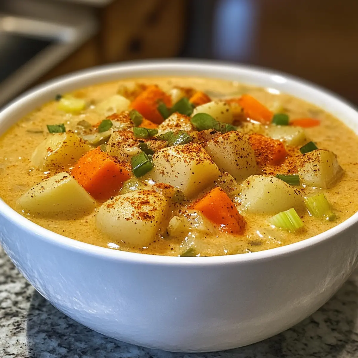 As the chill of fall settles in, there’s nothing quite like a bowl of warmth inviting you in from the cold. My Creamy Spicy Cajun Potato Soup is exactly that—a soothing hug for your taste buds! Bursting with a rich, velvety texture and bold, zesty flavors, this soup envelops you in a comforting embrace, making it an ideal companion for cozy evenings. Not only is it gluten-free and deliciously creamy, but it’s also a fantastic option for those seeking a quick, homemade meal that can easily be customized to suit your family’s preferences. So, whether you’re a spice lover or just looking for a heartwarming dish, this recipe will surely delight. Ready to spice up your cooking routine? Let’s dive into the ingredients and create something extraordinary together! Why Is Spicy Cajun Potato Soup a Must-Try? Comforting and creamy, this soup is your ultimate go-to for cold nights! With customizable options, it easily adapts to your tastes—try adding sausage or vegetables like corn for extra flavor. Quick to prepare, this recipe is perfect for busy evenings when you need a hearty meal without the fuss. The bold Cajun spices create a delightful kick, making it a favorite for spice lovers. And if you’re a fan of hearty soups, you’ll want to check out my Sweet Spicy Garlic or Chicken Ramen Spicy for more tasty options! Spicy Cajun Potato Soup Ingredients • The perfect blend for a cozy meal! For the Soup Base Potatoes – Adds heartiness and texture; use Yukon Gold for the best creamy consistency. Onion – Provides a base flavor that enhances overall taste; substitute with shallots for a milder kick. Celery – Adds crunch and freshness; can be replaced with bell peppers for a touch of sweetness. Carrots – Contributes natural sweetness and color; consider parsnips for a unique flavor twist. Garlic – Infuses aromatic depth; fresh garlic is preferred for the best taste experience. For the Flavor Cajun Spice Blend – Provides the signature spicy kick; try a homemade mix of paprika, cayenne, and oregano. Vegetable Broth – Serves as the soup base, adding depth; chicken broth can be used for a non-vegetarian option. For Creaminess Cream – Adds richness and a velvety mouthfeel; use coconut cream for a delicious dairy-free alternative. Now that you’ve gathered the ingredients for your Spicy Cajun Potato Soup, let’s move on to the tempting cooking process! Step‑by‑Step Instructions for Spicy Cajun Potato Soup Step 1: Prep Vegetables Begin by washing and peeling your potatoes, then chop them into bite-sized cubes. Dice the onion, celery, and carrots, and mince the garlic, setting all the prepared veggies aside. This essential step for your Spicy Cajun Potato Soup ensures even cooking and flavor distribution throughout the dish. Step 2: Sauté Base In a large pot, heat a splash of oil over medium heat. Once hot, add the diced onions, celery, and carrots, sautéing them for about 5 minutes until they soften and become fragrant. Stir in the minced garlic and cook for an additional minute, allowing the aromas to deepen and blend beautifully. Step 3: Add Potatoes & Broth Now it’s time to add the cubed potatoes into the pot, along with the Cajun spice blend for that signature kick! Pour in enough vegetable broth to cover the vegetables, typically around 6 cups, and stir to combine. Bring this flavorful mixture to a rolling boil over high heat, setting the stage for your creamy, spicy soup. Step 4: Simmer Once boiling, reduce the heat to low, covering the pot to let it simmer. Cook for about 25 minutes until the potatoes are tender when pierced with a fork. This simmering process is crucial as it melds the flavors of your Spicy Cajun Potato Soup, creating a soothing and hearty base. Step 5: Blend After the potatoes are tender, remove the pot from heat and carefully use an immersion blender to puree the soup until you achieve your desired texture. If you prefer a chunkier soup, blend only half of it. This blending step transforms your soup into a luxurious creamy delight with every spoonful. Step 6: Finish with Cream Return the pot to low heat and stir in the creamy element, whether it’s regular cream or coconut cream for a dairy-free option. Taste and adjust seasonings as necessary, allowing the soup to heat through gently without boiling. Your Spicy Cajun Potato Soup is now rich and velvety, ready to warm your soul! How to Store and Freeze Spicy Cajun Potato Soup Fridge: Store in an airtight container for up to 5 days. Allow the soup to cool completely before sealing to preserve freshness and flavor. Freezer: Freeze in freezer-safe containers for up to 3 months. Allow the soup to cool and portion before freezing for easy reheating. Reheating: Reheat gently on the stove over low heat, adding a splash of broth for consistency if it thickens too much. Avoid boiling to maintain creaminess. Make-Ahead: Perfect for meal prep! Prepare and store the Spicy Cajun Potato Soup ahead of time, allowing flavors to meld beautifully as it rests in the fridge. What to Serve with Creamy Spicy Cajun Potato Soup Cozying up with a bowl of soup is just the beginning; enhance your meal with delightful pairings that bring out all the flavors. Crusty Bread: Perfect for dipping, the rustic texture complements the creaminess of the soup, soaking up every luscious drop. Simple Green Salad: The fresh crunch of greens with a light vinaigrette provides a refreshing contrast, balancing the rich flavors beautifully. Spicy Shrimp: Juicy, seasoned shrimp adds a fiery kick that echoes the soup’s Cajun roots, creating a unified flavor experience. Cornbread Muffins: Sweet and moist, these fluffy muffins offer a comforting texture that pairs deliciously with the spiciness of the soup, making each bite memorable. Roasted Brussels Sprouts: Their caramelized exterior and nutty flavor bring a delightful crunch, harmonizing with the soup’s creamy smoothness. Garlic Breadsticks: Warm, buttery sticks infused with garlic