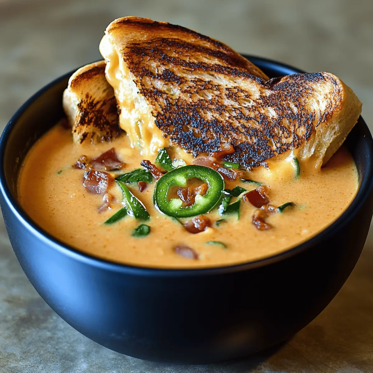 Experience the creamy and comforting Spicy Jalapeño Popper Soup with Grilled Cheese Dippers that ignites your taste buds with every spoonful.