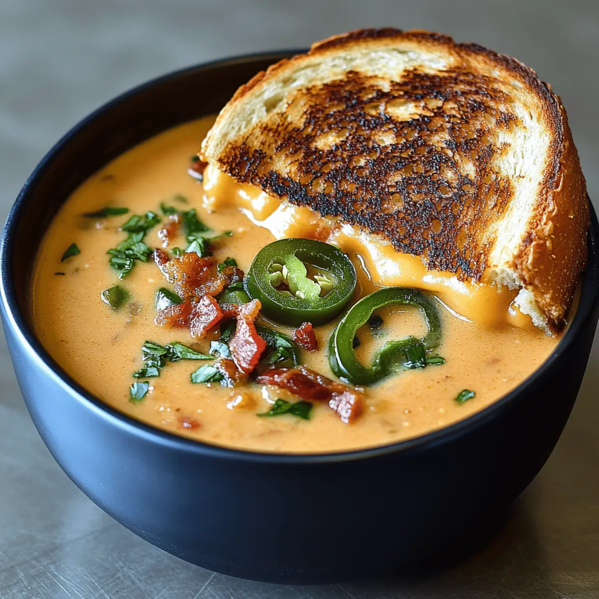 Ladle the spicy jalapeño popper soup into bowls and sprinkle the reserved crispy bacon bits on top for added flavor. Serve alongside the freshly grilled cheese dippers, perfect for scooping, and watch as everyone enjoys this comforting meal together.