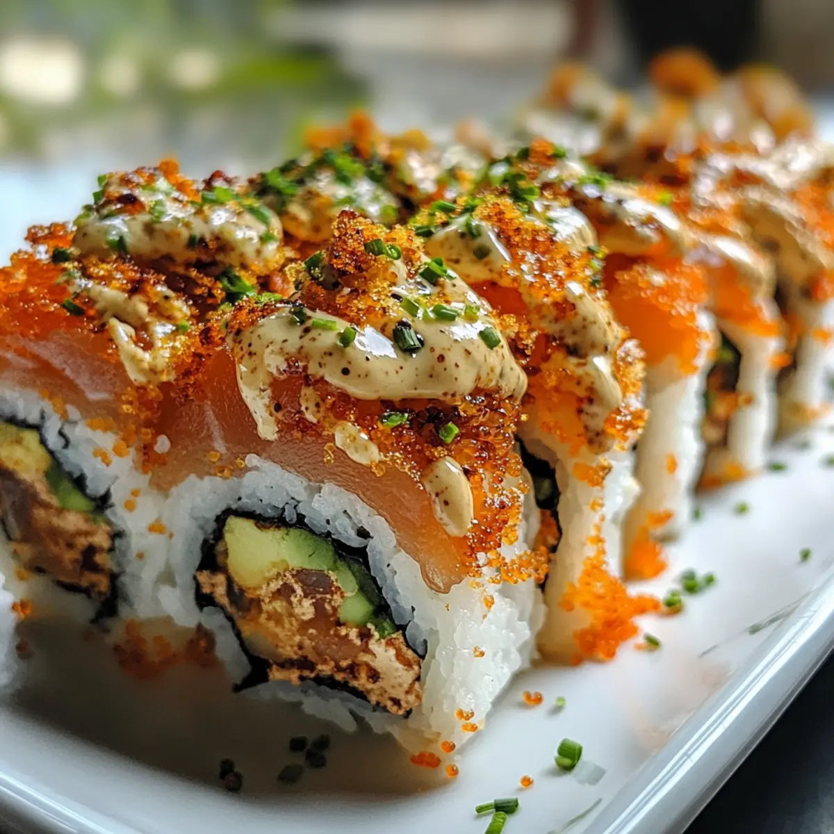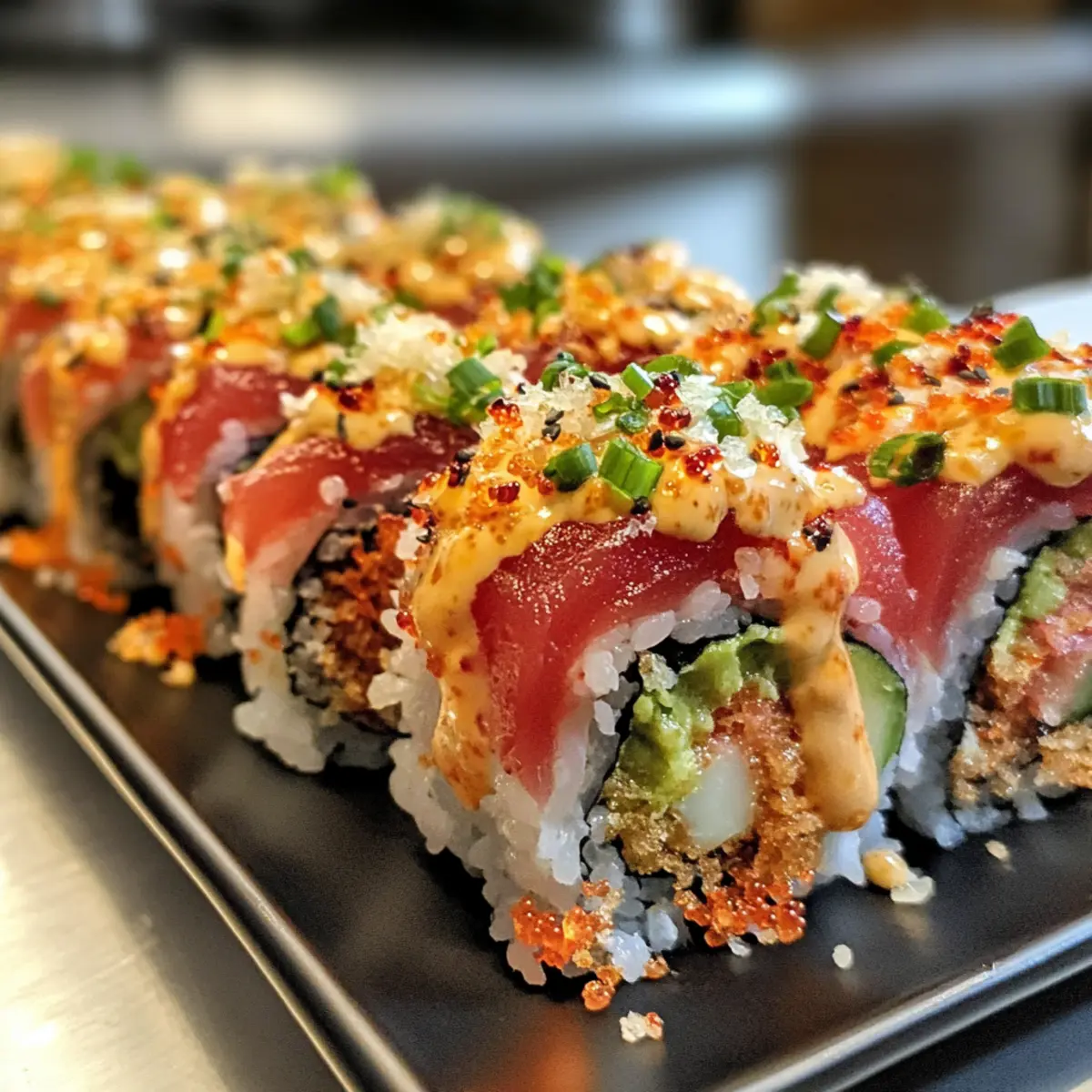 Standing in my kitchen, I suddenly had a craving that couldn’t be ignored—a culinary adventure that would take me straight to sushi paradise. Enter the Spicy Tuna Volcano Rolls, a mouthwatering fusion of savory tuna and a creamy, bubbling topping that’s sure to impress! These rolls are perfect for anyone looking to elevate their homemade sushi game while also enjoying a delightful DIY experience. Besides being a true crowd-pleaser, they offer a fantastic twist on traditional sushi with an irresistible baked topping that adds both warmth and texture. If you’ve ever dreamt of whipping up something unforgettable for your next dinner gathering or a cozy night in, look no further. Are you ready to roll? Why are Spicy Tuna Volcano Rolls a Must-Try? Irresistible Flavor Explosion: These rolls pack a punch of bold, spicy flavors combined with the creamy goodness of the topping, creating a truly unforgettable bite. Fun DIY Experience: Perfect for a sushi night at home, you’ll enjoy every step of the process, from rolling to baking. Impressive Presentation: The visual appeal of the bubbling volcano topping makes these rolls a showstopper at any dinner party. Versatile Ingredients: Feel free to customize the filling or topping—swap spicy tuna for crab or shrimp or adjust the sriracha heat to your liking. Quick to Prepare: In about an hour, you can treat your family and friends to restaurant-quality sushi right from your home kitchen! Try serving them alongside delicacies like Shrimp Rice Bowls Spicy or Biscoff Cookie Rolls for a complete feast! Spicy Tuna Volcano Rolls Ingredients • Get ready to indulge in a homemade sushi experience! For the Sushi Rice Sushi Rice – Use sushi rice for optimal sticky texture that holds the rolls together. Water – Hydrates the rice during cooking for that perfect fluffiness. Rice Vinegar – Adds tanginess and helps the rice absorb flavors beautifully. Sugar – Balances the acidity of the vinegar for a harmonious flavor. Salt – Enhances the overall taste of the rice base. For the Spicy Tuna Filling Sushi-Grade Tuna – Provides richness and a fresh taste; can swap with salmon for a different flavor. Mayonnaise – Adds creaminess to the filling, perfect for those rich flavors. Sriracha – Contributes heat and spice, essential for that spicy tuna experience. Soy Sauce – Enhances umami flavors in the filling, bringing everything together seamlessly. For the Volcano Topping Imitation Crab – Forms a creamy topping; substitute real crab if you prefer luxurious flavor. Cream Cheese – Provides a rich, tangy base; consider Greek yogurt for a lighter option. Mayonnaise – Combines with other ingredients to create that delectable volcano effect. Sriracha – Mix in to achieve your desired spice level for the topping. Let the cooking begin, and may your Spicy Tuna Volcano Rolls impress everyone around the table! Step‑by‑Step Instructions for Spicy Tuna Volcano Rolls Step 1: Cook Sushi Rice Rinse 1 cup of sushi rice under cold water until it runs clear, then combine it with 1 ¼ cups of water in a rice cooker. Cook according to the manufacturer’s instructions until tender, about 15–20 minutes. Once done, transfer the rice to a bowl, and while it’s cooling, season it with 2 tablespoons of rice vinegar, 1 tablespoon of sugar, and ½ teaspoon of salt, ensuring every grain is flavored. Step 2: Prepare Spicy Tuna Filling In a medium bowl, dice 8 ounces of sushi-grade tuna into small pieces. Add 2 tablespoons of mayonnaise, 1 tablespoon of sriracha, and 1 teaspoon of soy sauce. Stir until well combined, and taste to adjust the heat by adding more sriracha if desired. This spicy tuna mixture will provide a flavorful kick for your Spicy Tuna Volcano Rolls. Step 3: Make Volcano Topping In another bowl, combine 4 ounces of chopped imitation crab and 4 ounces of softened cream cheese. Also, mix in 2 tablespoons of mayonnaise and 1 tablespoon of sriracha. Blend everything until smooth and creamy. This luscious volcano topping will give your rolls that dramatic baked finish, creating a delightful contrast to the cool tuna filling. Step 4: Assemble Rolls Lay a bamboo sushi mat on a clean surface. Place a sheet of nori, shiny side down, on the mat. With wet hands, spread a thin layer of sushi rice evenly over the nori, leaving about 1 inch at the top edge. Spoon the spicy tuna filling along the center. Optionally, add slices of avocado for extra creaminess, then roll tightly from the bottom, using the mat to help shape it into a cylinder. Step 5: Top and Bake Preheat your oven to 400°F (200°C). Carefully slice the assembled rolls into 6-8 pieces and place them on a baking sheet lined with parchment paper. Generously spoon the creamy volcano topping over each roll, ensuring it is well-coated. Bake in the preheated oven for about 10 minutes, or until the topping is bubbly and golden brown, creating an enticing appearance. Step 6: Serve Warm Remove the baking sheet from the oven and let the Spicy Tuna Volcano Rolls cool slightly before serving. For the best experience, enjoy them warm, garnished with any leftover spicy tuna mixture or a drizzle of soy sauce. The combination of flavors and textures will make your homemade sushi a memorable treat for any occasion! Expert Tips for Spicy Tuna Volcano Rolls Rice Perfection: Ensure your sushi rice is well-rinsed and cooked just right—overcooked rice can lead to mushy rolls. Sharp Knife: Use a very sharp knife to slice your rolls, which prevents tearing the nori and creates beautiful, clean edges. Rolling Technique: Practice rolling tightly but gently; too much pressure can squish the filling out, while a loose roll may fall apart. Customize Carefully: When swapping ingredients, like using crab instead of tuna, ensure to balance flavors so the spicy tuna volcano rolls remain delicious. Serve Immediately: Enjoy your rolls fresh out of the oven for that ideal contrast between creamy topping and sticky rice, maximi
