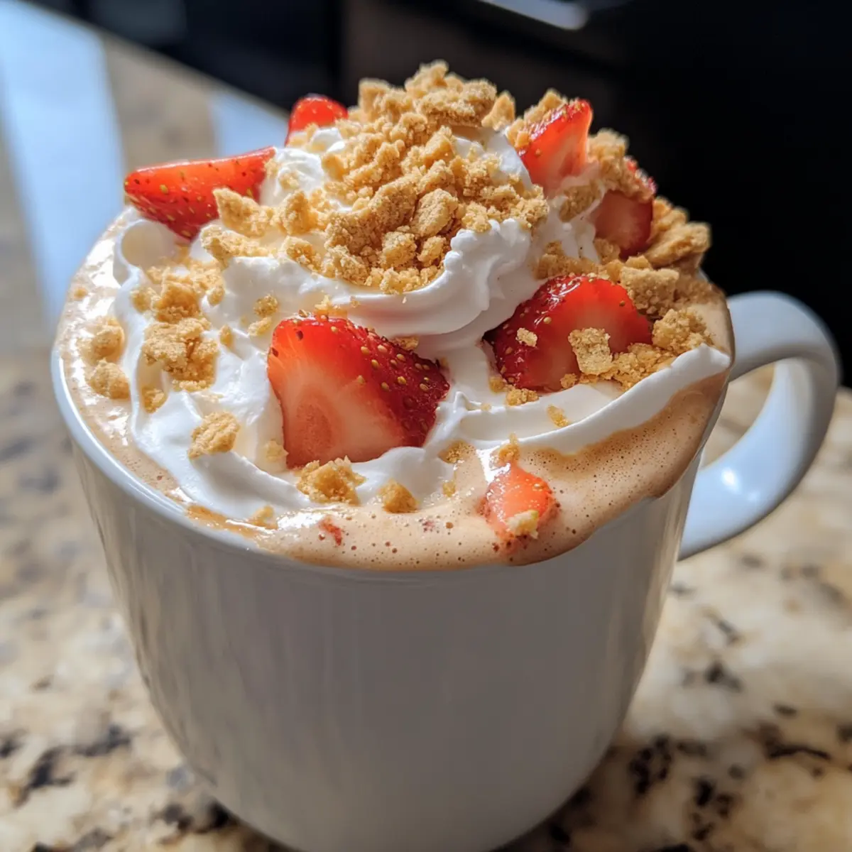 To elevate your Strawberry Shortcake Latte, top it off with a generous swirl of whipped cream. For extra flair, sprinkle some crushed graham crackers on top, reminiscent of a classic strawberry shortcake. You might also want to add extra diced strawberries and a drizzle of strawberry syrup for a visually stunning and deliciously indulgent finish.