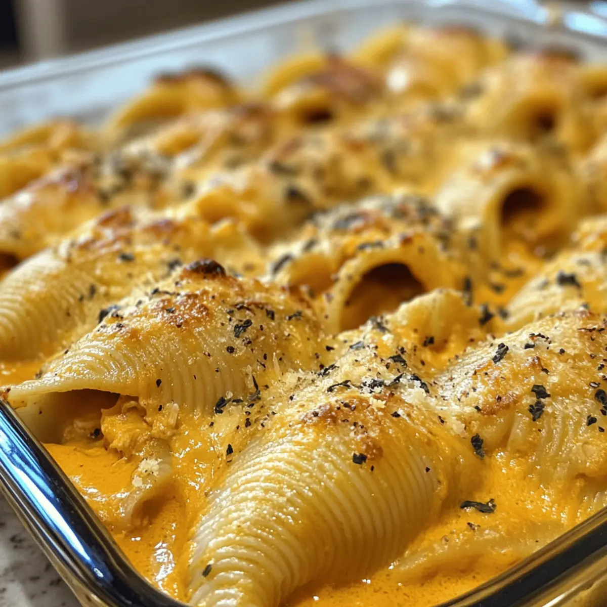 Indulge in creamy stuffed shells filled with cheese and smothered in flavorful pumpkin cream sauce, a perfect fall dish.