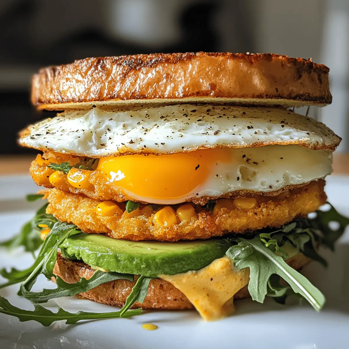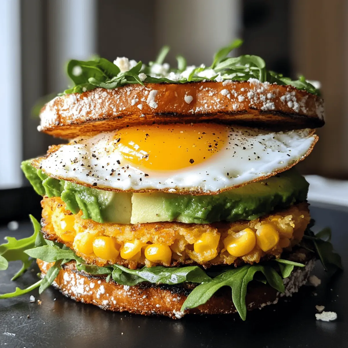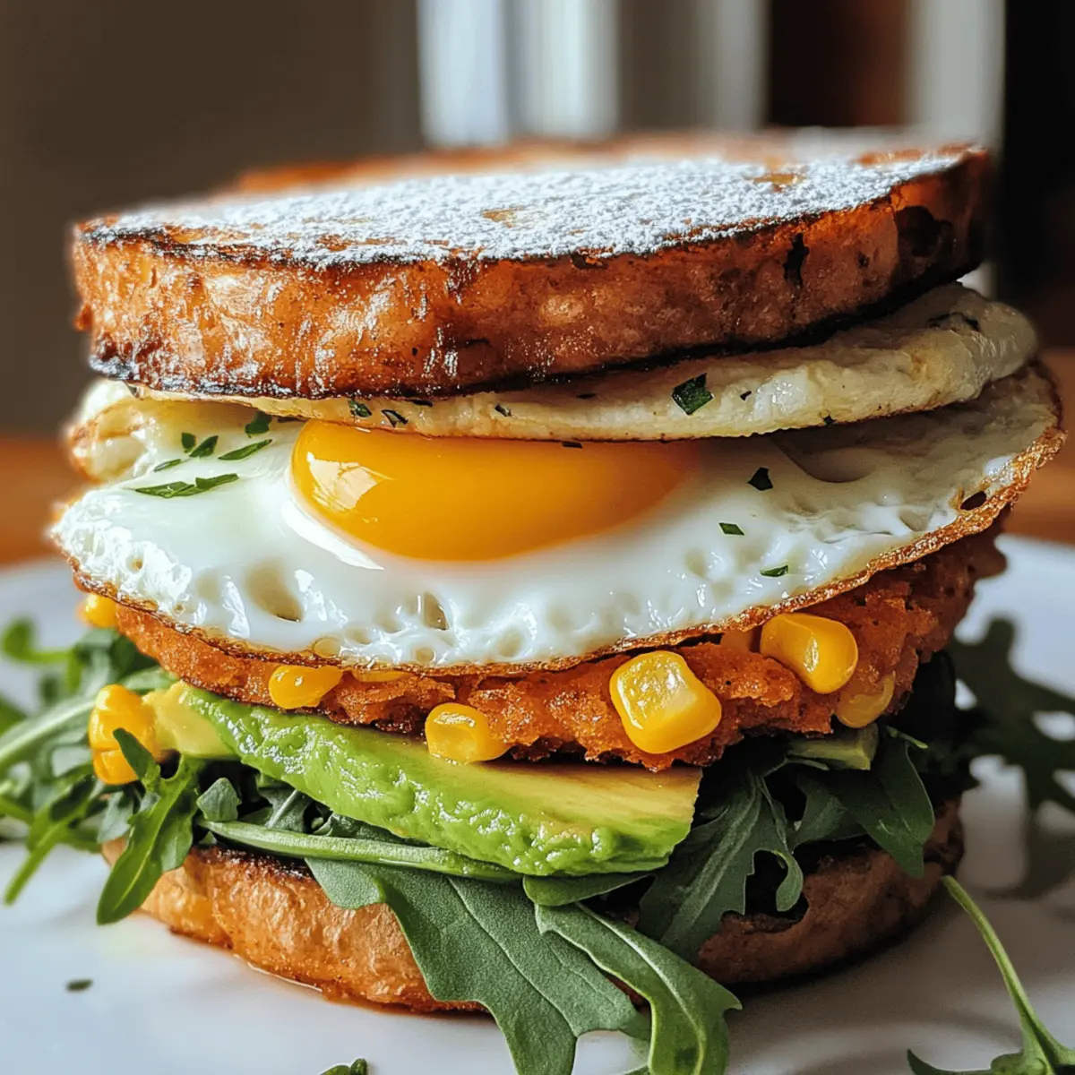 To create each sandwich, start with one crispy corn fritter as the base. Gently place a cooked egg on top, followed by optional crispy bacon or sausage patties for added flavor. Add sliced avocado and a handful of fresh arugula, which provide creaminess and a peppery kick. Finish with another fritter on top to seal your Sweet Corn Fritter Breakfast Sandwich.