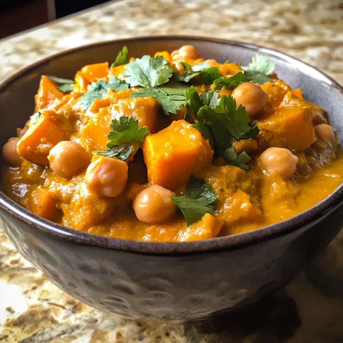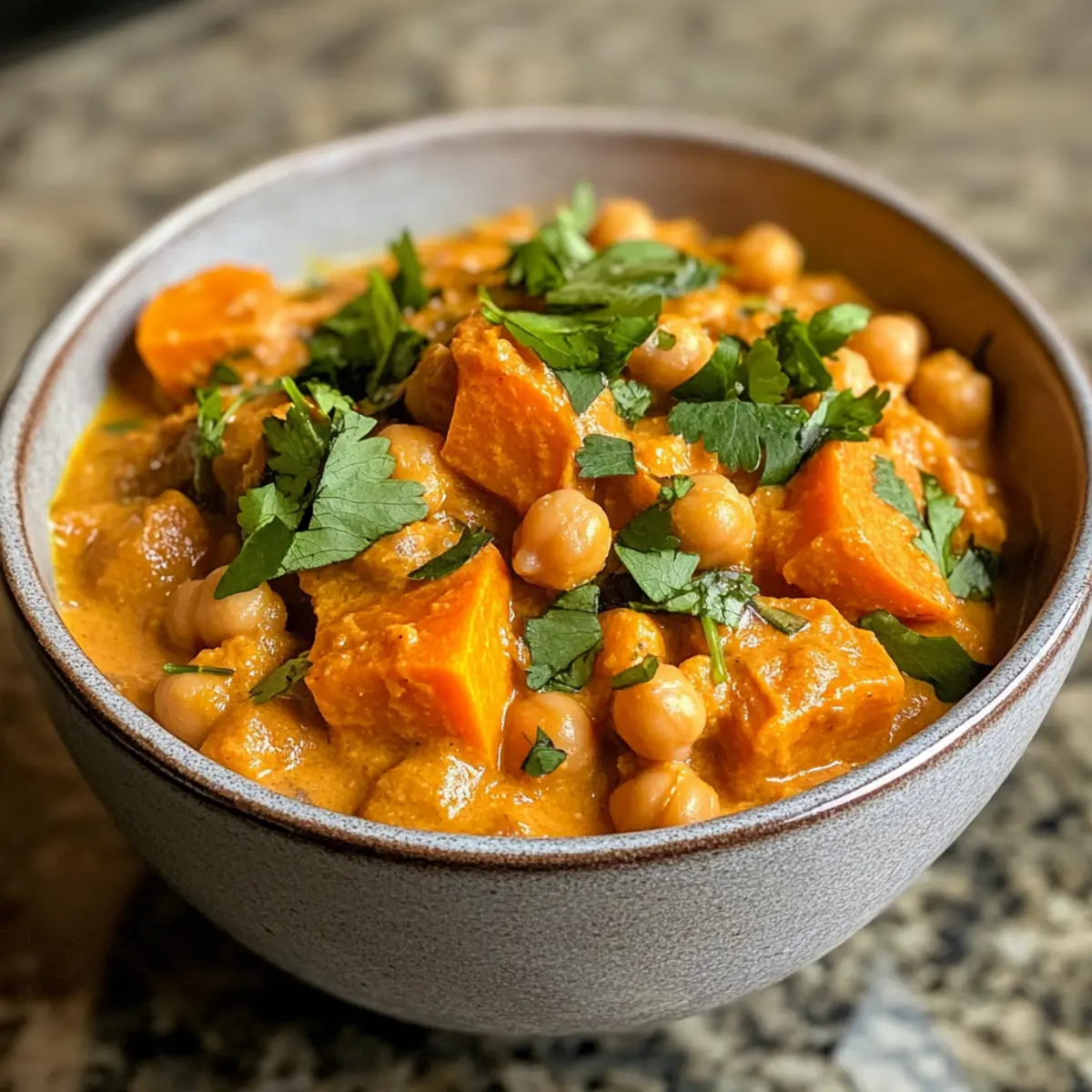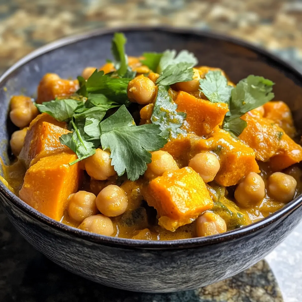 The aroma wafts through the kitchen like a warm hug on a chilly evening. My latest creation, Sweet Potato Chickpea Curry, is a luscious blend of flavors and textures that turns any weeknight dinner into a special occasion. This vegan delight is not just about satisfying your taste buds; it’s a quick and nourishing meal packed with plant-based goodness. With creamy coconut milk enveloping tender sweet potatoes and hearty chickpeas, each bite is a reminder of how easy it can be to eat well without compromising on comfort. Plus, it’s perfect for meal prep, making those busy nights a breeze. Ready to fill your home with the enticing scent of spices and warmth? Let’s dive into this delightful recipe! Why is this curry a must-try? Flavorful Comfort: Each spoonful of this Sweet Potato Chickpea Curry bursts with spices that create a warm, inviting sensation, perfect for cozy dinners. Quick Prep and Cook Time: Whip up this hearty dish in 30 minutes or less, making it ideal for those busy weeknights when you crave something nourishing yet satisfying. Nutrient-Packed Goodness: Filled with protein from chickpeas and fiber-rich sweet potatoes, it’s not just delicious but also provides essential nutrients for your body. Endless Variations: Customize your curry by adding greens or swapping out chickpeas for lentils – the possibilities are endless! Meal Prep Friendly: Make a big batch to enjoy throughout the week, just like I do with my Sweet Honey Glazed Carrots or Shrimp Mashed Potatoes. This dish is your solution to quick, fulfilling meals that don’t skimp on flavor! Sweet Potato Chickpea Curry Ingredients For the Base • Avocado Oil – Ideal for sautéing; you can substitute with extra virgin olive oil if needed. • Onion – Yellow onion adds a rich sweetness; white onion works in a pinch. • Garlic – Freshly minced garlic brings a wonderful aroma; bottled minced garlic can be a quick substitute. • Ginger – Use a 1-inch piece of minced fresh ginger to infuse warmth into the dish. For the Spices • Garam Masala – This signature Indian spice blend elevates the curry’s flavor; a high-quality blend is recommended. • Curry Powder – Provides an earthy foundation, typically containing turmeric. • Ground Cumin – Enhances the overall depth and aroma; don’t skip this! For the Main Ingredients • Diced Tomatoes – One 14 oz can (or 3 fresh tomatoes) adds natural sweetness and acidity to balance the dish. • Chickpeas – Use 3½ cups from two 14 oz cans, drained and rinsed; cooked dried chickpeas are another great option. • Coconut Milk – Full-fat coconut milk is best for luxurious creaminess in this Sweet Potato Chickpea Curry. • Sweet Potato – One medium, peeled and cubed into ½-inch pieces adds sweetness and nutrition; Jewel or Garnett varieties are lovely. • Sea Salt & Black Pepper – Essential for seasoning; adjust to your taste preference. For Garnish and Serving • Lime Juice – Two tablespoons add a bright zing (optional but recommended). • Cilantro – ¼ cup, chopped, to sprinkle on top for a fresh finish. • Brown Rice/Vegan Naan – Perfect for serving with the curry, making it a complete meal. Now that you have all the ingredients ready, it’s time to roll up your sleeves and bring this delicious Sweet Potato Chickpea Curry to life! Step‑by‑Step Instructions for Sweet Potato and Chickpea Curry Step 1: Sauté the Base In a large skillet, heat 2 tablespoons of avocado oil over medium heat until it shimmers. Add one diced yellow onion, 3 minced garlic cloves, and a 1-inch piece of minced fresh ginger. Sauté these aromatics for about 4 minutes until the onion becomes soft and translucent, stirring occasionally to ensure even cooking. Step 2: Toast the Spices Next, sprinkle in 1 teaspoon of garam masala, 1 teaspoon of curry powder, and 1 teaspoon of ground cumin. Allow the spices to toast for about 30 seconds without stirring; this will enhance their flavors beautifully. You’ll know it’s ready when the mixture becomes fragrant and slightly darker in color. Step 3: Incorporate the Tomatoes Add one 14 oz can of diced tomatoes to the skillet, stirring to combine with the seasoned onion and spices. Cook this mixture for approximately 5 minutes until the tomatoes break down and soften, bubbling gently. The vibrant color should deepen, and it should smell incredible. Step 4: Add the Heart of the Curry Now, introduce 3½ cups of drained and rinsed chickpeas, 1 can of full-fat coconut milk, and your cubed sweet potato into the skillet. Season with sea salt and black pepper to taste. Stir well until everything is nicely combined, then bring the mixture to a gentle simmer by increasing the heat slightly. Step 5: Simmer for Tenderness Once simmering, cover the skillet and reduce the heat to low. Let the Sweet Potato and Chickpea Curry simmer for 20-25 minutes, stirring occasionally. The sweet potatoes should become tender and the flavors meld into a creamy, fragrant sauce, with the curry bubbling softly beneath the lid. Step 6: Finish with Brightness After the simmering time, uncover the skillet and stir in 2 tablespoons of lime juice, if desired, to brighten the flavors. Taste the curry and adjust seasoning as needed, adding more salt, pepper, or lime juice according to your preference for a perfectly balanced dish. Step 7: Serve and Garnish Finally, serve your Sweet Potato and Chickpea Curry hot, paired with brown rice or vegan naan for a satisfying meal. Garnish with ¼ cup of chopped cilantro for a fresh pop of color and flavor. Enjoy this delightful, hearty dish that warms the soul! Make Ahead Options Preparing this Sweet Potato Chickpea Curry ahead of time is a fantastic way to save precious minutes during hectic weeknights! You can chop and store the sweet potatoes, onion, garlic, and ginger up to 24 hours in advance—just keep them in airtight containers in the refrigerator to maintain their freshness. Additionally, you can measure and m