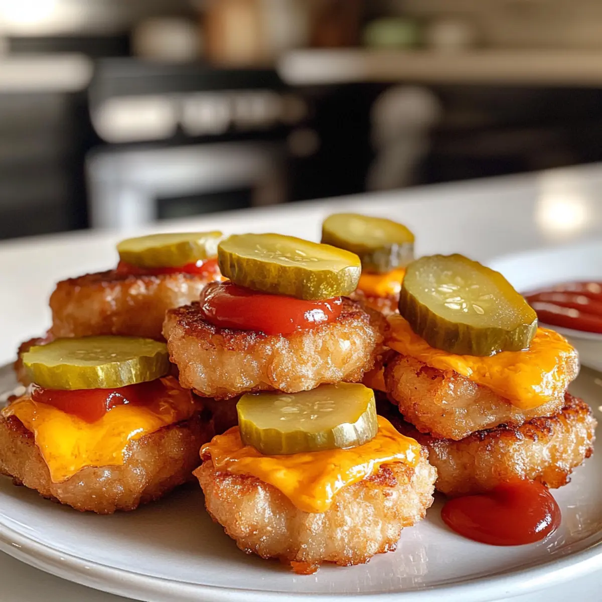 Arrange your assembled Tater Tot Mini Cheeseburger Bites on a serving platter. For an extra touch, sprinkle them with sesame seeds or garnish with chopped chives if desired. These bites are best enjoyed warm and fresh, so serve them immediately alongside your favorite dipping sauces for an exciting flavor experience!