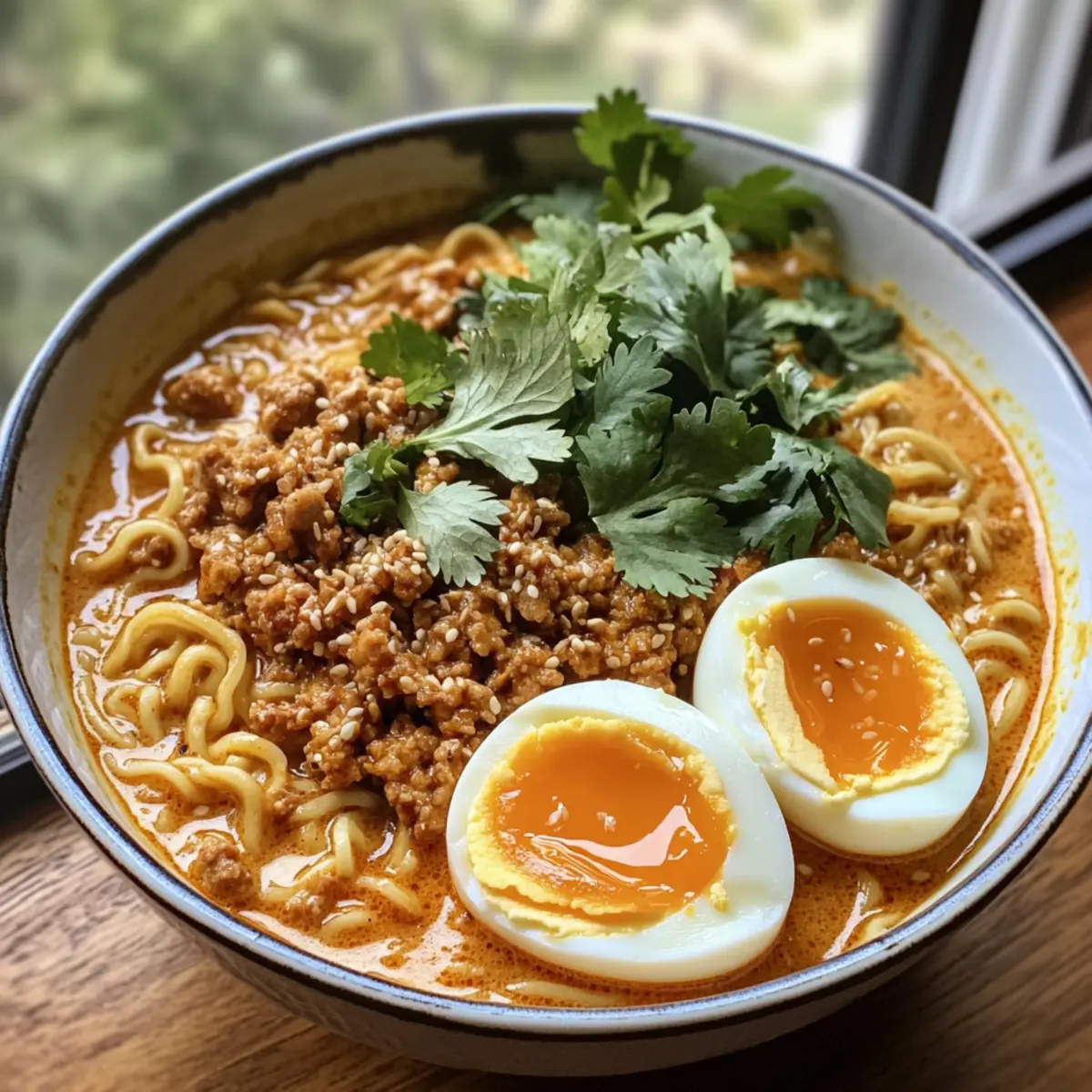 Sipping on a steaming bowl of Thai Coconut Curry Ramen is like wrapping yourself in a cozy blanket on a brisk evening. In just 30 minutes, you can whip up this delightful dish that combines the creaminess of coconut milk with the aromatic kick of red curry paste. The beauty of this ramen lies not only in its warm, comforting broth but also in its incredible versatility—customize it with your choice of protein and veggies, making it a quick and easy meal perfect for busy weeknights. Plus, it’s gluten-free optional, so everyone can join in on this flavorful experience. Are you ready to dive into a bowl of this culinary delight? Why is this ramen a must-try? Quick, easy dinner solution: Whip this up in just 30 minutes—perfect for busy weeknights! Customizable goodness: Choose from various proteins and veggies to suit your taste preferences or dietary needs. Rich, creamy flavor: The delightful combination of coconut milk and red curry paste creates a warming, indulgent broth. Versatile ingredients: Swap in gluten-free noodles or different curry pastes for endless variations! Crowd-pleaser: It’s comforting and flavorful, making it a hit with family and friends alike. If you’re curious about more quick meals, check out my Fiery Chicken Ramen for another tasty option! Thai Coconut Curry Ramen Ingredients • Perfect for crafting your own bowl! For the Broth Instant Ramen Noodles – The ideal base; remember to discard the flavor packets! Canola Oil – Great for sautéing; swap for vegetable or peanut oil if desired. Shallots – Infuse sweet onion flavor; yellow onion works if shallots are unavailable. Red Curry Paste – Provides essential heat and depth; brands like Mae Ploy or Thai Kitchen are recommended. Tomato Paste – Adds a touch of sweetness; feel free to omit for a lighter taste. Garlic – A must-have for aroma and flavor; use fresh for the best results. Fresh Ginger – For a warm and spicy note; ground ginger can be a helpful substitute. Coconut Milk – Delivers a creamy texture; opt for full-fat for richness or lite for fewer calories. Chicken Stock – The foundational liquid for the broth; substitute vegetable broth for a vegetarian version. Toasted Sesame Oil – Imparts a rich, nutty flavor; opt for regular sesame oil if needed. For the Protein Ground Pork – The main protein in this version; substitute ground chicken, turkey, or tofu for a vegetarian delight! For the Heat Fresno Chili – Adds that spicy kick; any medium-hot chili will do the trick. Fish Sauce – Essential for a true umami experience; use soy sauce as a vegetarian swap. Kosher Salt & Black Pepper – For seasoning; adjust to suit your taste. For Garnishing Soft-Boiled Eggs – These create richness as a topping; feel free to substitute with poached or hard-boiled eggs. Fresh Cilantro – Adds a burst of fresh flavor; mint or green onion works too. Green Onions – Enhances texture and flavor; can skip if you’re in a pinch. Toasted Sesame Seeds – Optional but adds a nice crunch to the dish. Step‑by‑Step Instructions for Thai Coconut Curry Ramen Step 1: Cook Noodles Begin by bringing a pot of water to a boil over high heat. Add the instant ramen noodles and cook for just 2-3 minutes until they are tender yet al dente. Drain the noodles in a colander and set them aside to keep warm while preparing the broth for your Thai Coconut Curry Ramen. Step 2: Sauté Aromatics In a large pot, heat 2 tablespoons of canola oil over medium heat. Add in the sliced shallots and sauté for about 3 minutes until they turn translucent and fragrant. This base adds a sweet onion flavor to the broth, creating a perfect foundation for your Thai Coconut Curry Ramen. Step 3: Build Flavor Stir in 2 tablespoons of red curry paste along with 1 tablespoon of tomato paste, 2 minced garlic cloves, and 1 tablespoon of freshly grated ginger. Cook for 2 minutes, allowing the mixture to become aromatic and beautifully blended. The vibrant colors and scents signal that it’s time to add the liquid ingredients for your broth. Step 4: Prepare Broth Pour in one can of coconut milk and 3 cups of chicken stock, stirring to combine everything. Increase the heat and bring the mixture to a boil. Once boiling, reduce the heat to low, cover the pot, and let it simmer gently for 8-10 minutes, allowing the flavors to meld beautifully in your Thai Coconut Curry Ramen. Step 5: Cook Pork In a separate skillet, heat 1 tablespoon of toasted sesame oil over medium-high heat. Add 1 pound of ground pork along with a minced Fresno chili and another garlic clove. Cook for 3-5 minutes until the pork is browned and cooked through, stirring occasionally to ensure even cooking. Season with fish sauce, kosher salt, and black pepper to taste. Step 6: Serve Divide the warm cooked noodles into serving bowls. Carefully ladle the rich broth over the noodles, then top each bowl with a generous portion of the sautéed pork. Finally, add halved soft-boiled eggs, a sprinkle of fresh cilantro, sliced green onions, and toasted sesame seeds for that perfect finishing touch to your Thai Coconut Curry Ramen. Thai Coconut Curry Ramen Variations Feel free to unleash your culinary creativity and make this dish uniquely yours with delightful twists and substitutions! Alternate Protein: Swap pork for ground chicken, shrimp, or tofu for a vegetarian delight. Each option offers a unique character to the dish! Curry Paste Options: Use green curry paste instead of red for a vibrant change. This simple switch can brighten up the flavors in an unexpected way. Vegetable Boost: Toss in any combination of veggies like bok choy, snap peas, or mushrooms. This not only adds nutrition but brings delightful colors to your bowl. Noodle Variety: Try different noodles like udon or soba, or choose gluten-free options for a versatile dish that caters to everyone. Spice Level Adjustment: For a milder experience, reduce the Fresno chili or omit it entirely. You can always add a dash of chi