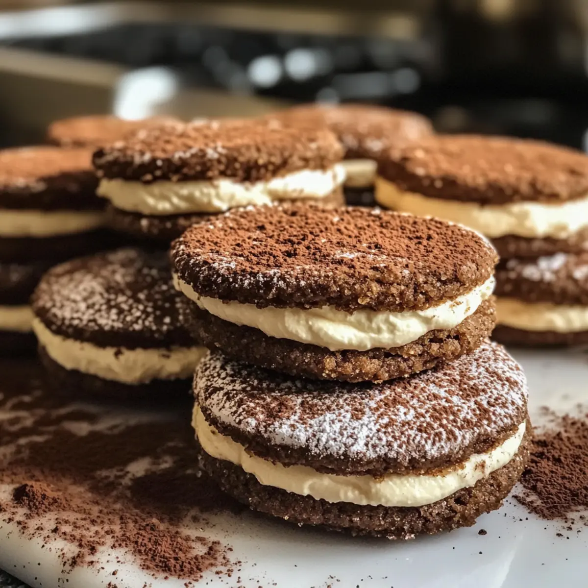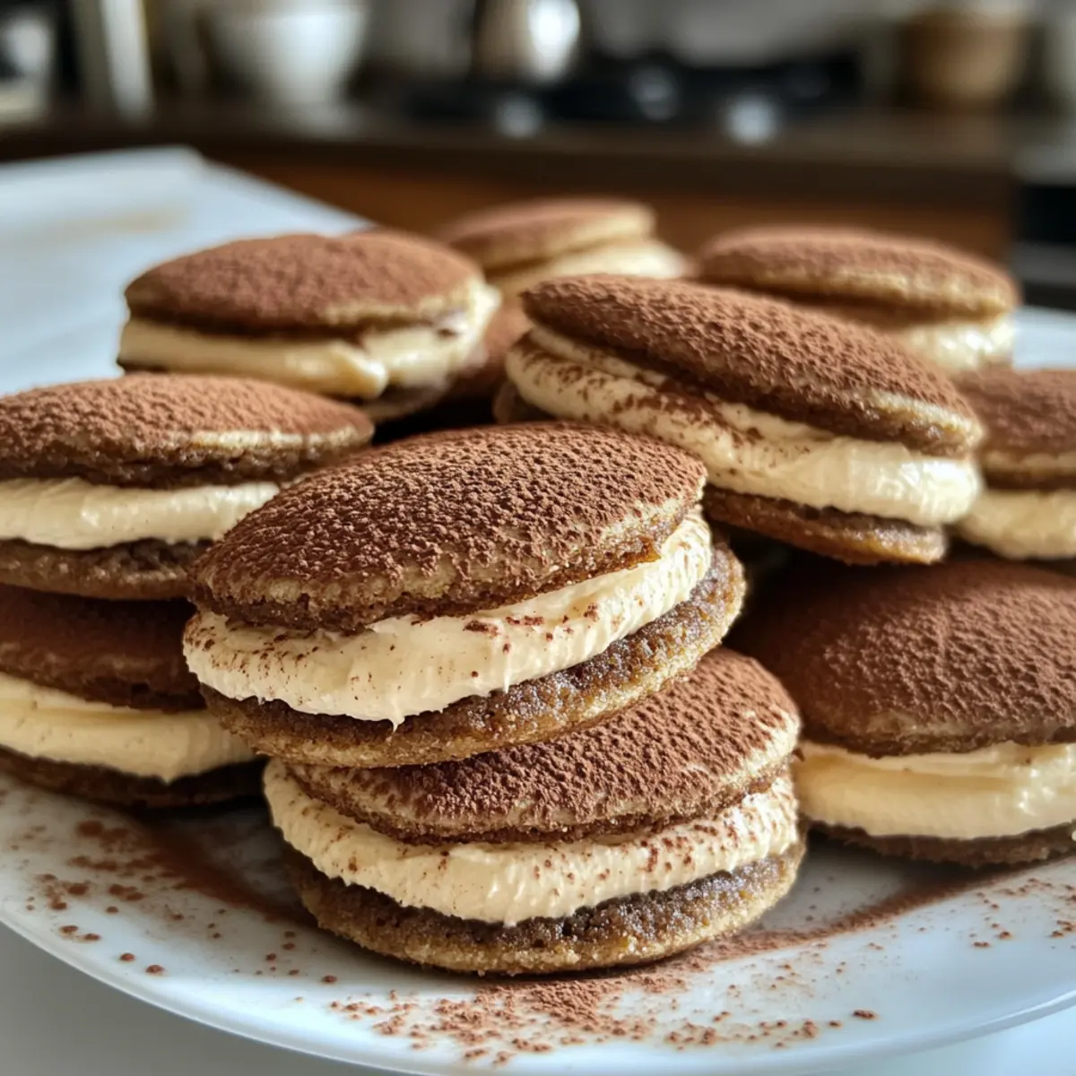 There’s something magical about the aroma of fresh coffee wafting through the kitchen, especially when it signals the start of making Tiramisu Cookies. These delightful little bites capture the essence of the beloved Italian dessert, combining rich espresso and creamy mascarpone into a soft, chewy masterpiece. Not only are Tiramisu Cookies quick to whip up, making them a fantastic choice for unexpected guests, but they also offer a luxurious treat that’s perfect for sharing with friends over afternoon coffee. Imagine surprising your loved ones with cookies that taste as indulgent as their fancy cafe counterparts, all while harking back to the classic tiramisu we adore. Curious to see how simple ingredients can transform into these delectable treats? Let’s dive in! Why Choose Tiramisu Cookies? Indulgent flavors: Each bite is a delightful union of rich espresso and creamy mascarpone, reminiscent of your favorite Italian dessert. Simple to make: With straightforward steps and common ingredients, you can create these impressive cookies in no time. Perfect for sharing: Whether it’s a festive gathering or a casual coffee date, these cookies are sure to wow your guests. Crowd-pleaser: Coffee lovers and dessert aficionados alike will be begging for the recipe! Versatile options: Consider adding chocolate chips or experimenting with flavored liqueurs for personal twists. If you enjoy unique variations, check out these Peanut Butter Cookies or Strawberry Cheesecake Cookies for an adventure in flavor! Tiramisu Cookies Ingredients For the Cookie Dough • All-Purpose Flour – Provides structure; gluten-free flour works as a great substitute if desired. • Baking Powder – Essential for a slight rise, ensuring the perfect texture. • Salt – Enhances flavor; adjust if using salted butter. • Unsalted Butter – Adds richness; can switch to salted butter without changing added salt. • Granulated Sugar – Sweetens the dough and helps achieve a soft, tender cookie. • Eggs (large) – Binds the ingredients and keeps the cookies moist; crucial for structure. • Vanilla Extract – Adds depth of flavor; consider almond extract for a unique twist. • Instant Coffee Granules – Delivers that bold espresso flavor; espresso powder enhances intensity. • Hot Water – Helps dissolve the coffee granules for seamless incorporation. For the Creamy Filling • Mascarpone Cheese – Provides a rich, creamy filling; swap for cream cheese if you prefer a tangy note. • Heavy Cream – Essential for achieving a luxuriously smooth texture in your filling. • Coffee Liqueur – Optional but recommended for an extra flavor boost; feel free to omit if desired. For Dusting • Cocoa Powder – A beautiful finish atop your cookies; unsweetened cocoa offers the best flavor balance. These sumptuous Tiramisu Cookies are sure to bring a taste of Italy straight to your kitchen, making them a delightful treat for any occasion! Step‑by‑Step Instructions for Tiramisu Cookies Step 1: Preheat and Prepare Begin by preheating your oven to 350°F (175°C). While it warms, line two baking sheets with parchment paper, ensuring a non-stick surface for your baking. This will help the Tiramisu Cookies cook evenly and makes for easy cleanup afterward, setting the stage for your delicious treats! Step 2: Combine Dry Ingredients In a medium bowl, whisk together the all-purpose flour, baking powder, and salt until well blended. This essential step ensures that your Tiramisu Cookies have the right structure. Look for a uniform mixture, free from any clumps, as you prepare to incorporate it into the wet ingredients. Step 3: Cream Butter and Sugar In a large mixing bowl, beat the softened unsalted butter and granulated sugar together using an electric mixer on medium speed. Mix for about 3-4 minutes until the mixture is light in color and fluffy. The key is achieving a creamy texture that will lend softness to your Tiramisu Cookies, inviting guests with its sweet aroma. Step 4: Add Eggs and Vanilla Add the large eggs one at a time to the butter-sugar mixture, beating well after each addition. Then, blend in the vanilla extract, ensuring it is fully incorporated. You’ll want to see a glossy texture developing, which signals the right consistency for your dough. Step 5: Incorporate Coffee Mixture Dissolve the instant coffee granules in hot water, stirring to ensure a smooth mixture. Gradually mix this coffee infusion into your butter mixture until fully combined. The rich espresso flavor will enhance your Tiramisu Cookies, making each bite a delightful coffee experience. Step 6: Mix in Dry Ingredients Slowly add the previously combined dry ingredients to the wet ingredients, mixing on low speed just until incorporated. Be careful not to overmix; your dough should remain soft and somewhat sticky, which is ideal for shaping the cookies and achieving that lovely chewiness. Step 7: Shape the Cookies Using a cookie scoop or tablespoon, drop rounded portions of dough onto the prepared baking sheets, spacing them about two inches apart. This spacing allows the Tiramisu Cookies to spread slightly while baking, ensuring each cookie has enough room to form its perfect shape. Step 8: Bake the Cookies Place the baking sheets in your preheated oven, baking the cookies for 10-12 minutes. Keep an eye on them; you’re looking for golden edges while the centers still appear soft. This balance is key to the chewy texture that is a signature characteristic of Tiramisu Cookies. Step 9: Cool on Baking Sheets Once baked, remove the sheets from the oven and let the cookies cool on the sheets for about 5 minutes. This resting period allows them to set before transferring. You want them to firm up just a bit while retaining that irresistibly soft middle. Step 10: Make the Cream Filling While the cookies cool, prepare your creamy filling by mixing mascarpone cheese and heavy cream in a mixing bowl until smooth and airy. If using coffee liqueur, 