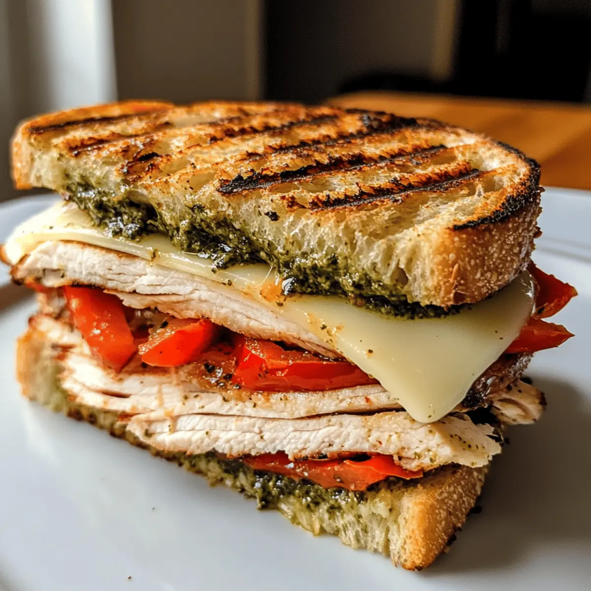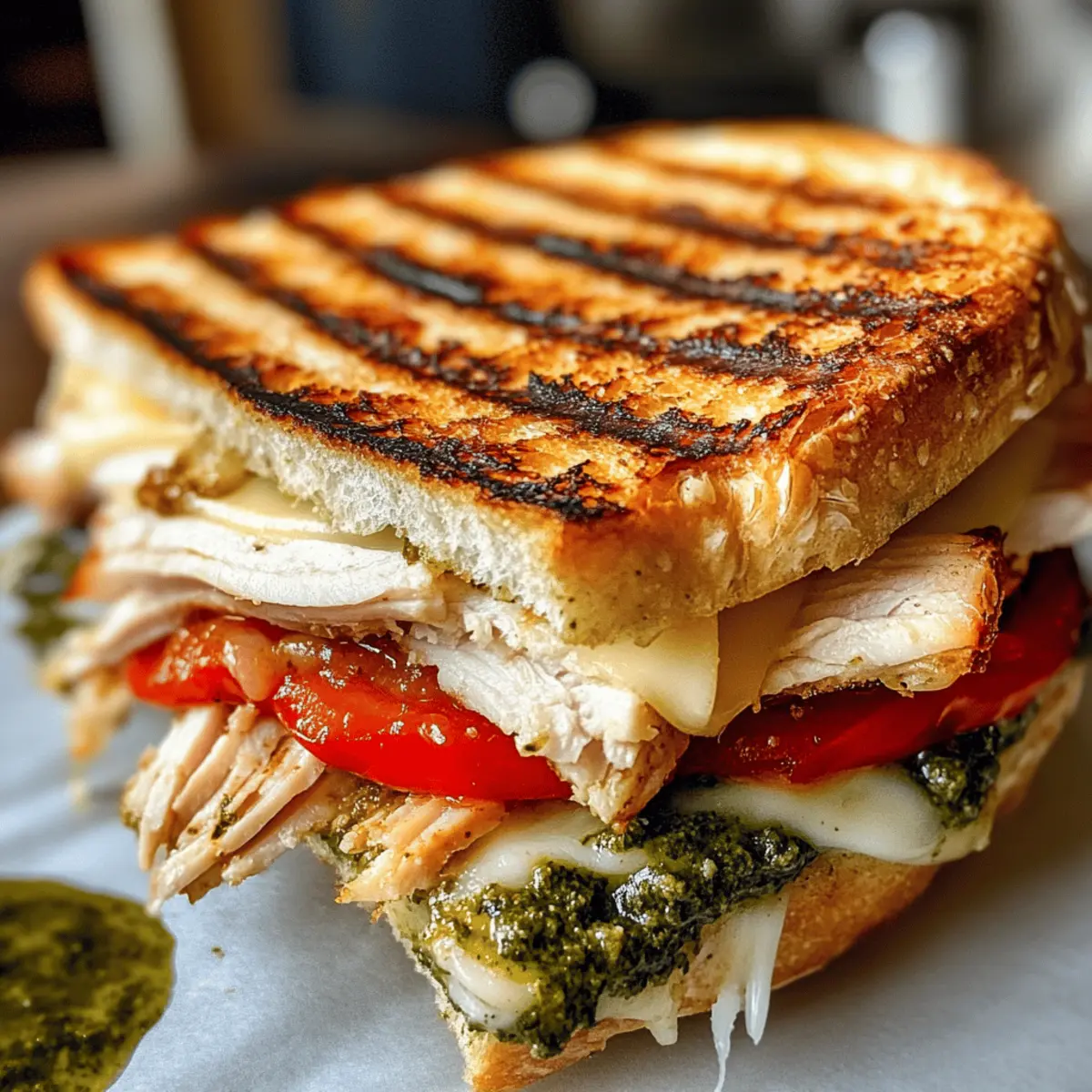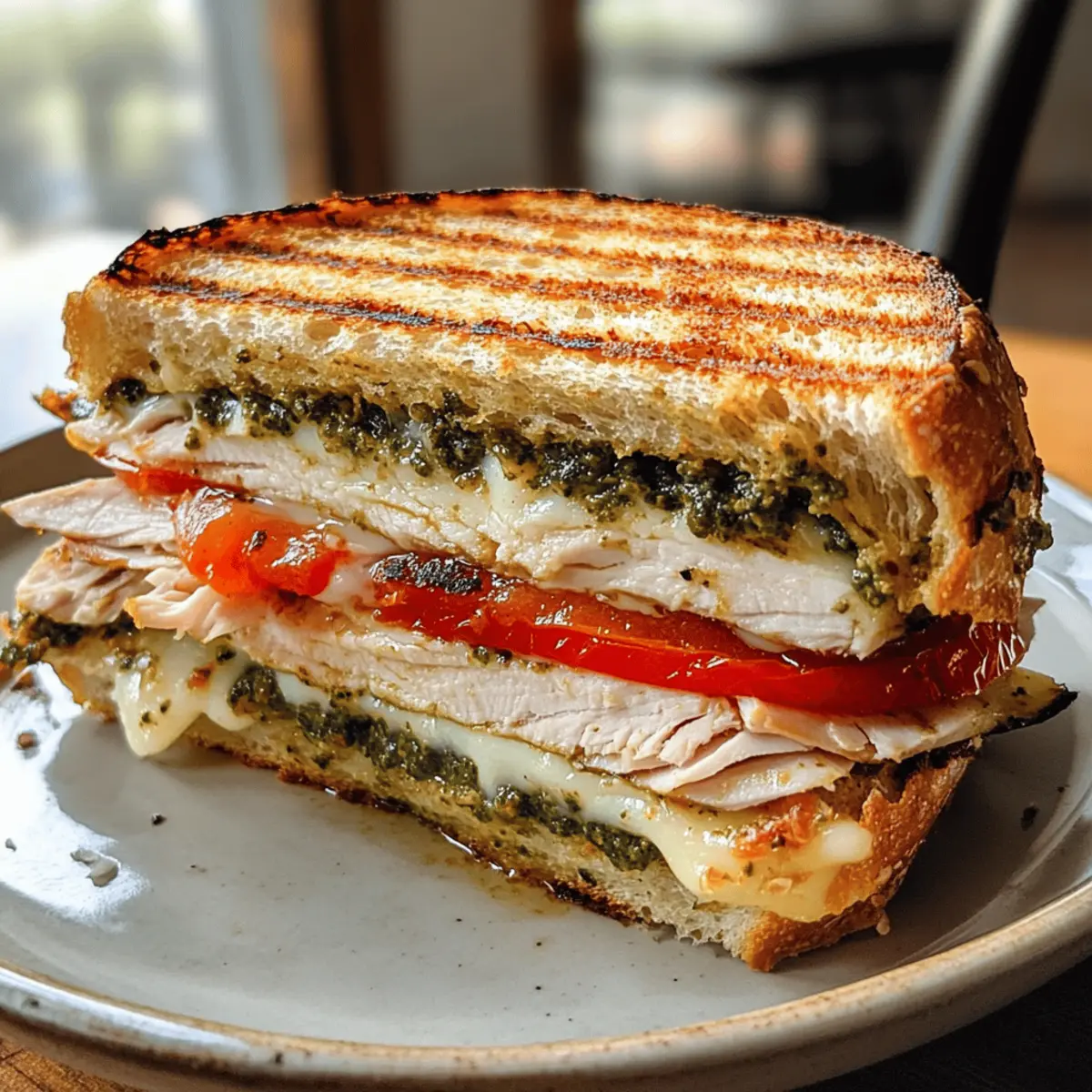 As I stood in my kitchen, the smell of basil pesto wafting through the air transported me to my favorite café, where their Turkey Pesto Panini is always a delightful indulgence. This homemade version features melty provolone cheese, tender deli turkey, and sweet roasted red peppers, all tucked into crispy ciabatta bread. The beauty of this recipe lies in its convenience—ready in just 15 minutes, it’s the perfect quick meal that never compromises on flavor. Plus, you can get creative with your ingredients, leaving room for delicious variations, especially when using Thanksgiving leftovers. Are you ready to elevate your sandwich game and savor every bite? Let’s dive into this delicious journey together! Why Is This Turkey Pesto Panini Amazing? Versatile Creation: This Turkey Pesto Panini allows you to customize each bite to your liking, whether it’s adding leftover turkey from your holiday feast or swapping in seasonal veggies. Quick and Easy: You’ll love how this recipe comes together in just 15 minutes, making it a lifesaver on busy weeknights or lazy weekends. Rich, Flavorful Textures: The combination of melty provolone, savory pesto, and sweet roasted red peppers creates a mouthwatering adventure with each bite, reminiscent of a favorite café treat. Ideal for Leftovers: Don’t let your holiday turkey go to waste! Transform it into a delightful sandwich that breathes new life into your meals, just like my Ground Turkey Teriyaki uses up leftovers deliciously. Crowd-Pleaser: Whether you’re hosting friends or feeding the family, this panini is sure to impress everyone at the table with its comforting flavors and satisfying crunch. Simple Ingredients: You can whip this up with just a handful of pantry staples, making it a quick go-to meal you can enjoy anytime. Turkey Pesto Panini Ingredients • Perfect for a quick meal! For the Sandwich Ciabatta Bread – This bread provides the ideal chewy texture and crispiness; feel free to substitute with focaccia for extra flavor. Pesto – Adds a burst of herbaceous flavor; both homemade and store-bought varieties work wonders in this Turkey Pesto Panini. Deli Turkey – Gives the sandwich its hearty protein base; roast turkey or chicken are delicious alternatives that work beautifully. Roasted Red Peppers – Introduces sweetness and texture; fresh bell peppers can be used if roasting isn’t an option, but roasting brings out a richer flavor. Provolone Cheese – Melts superbly, lending creaminess; try mozzarella or Monterey Jack for a different twist in your panini. For Extra Flavor Spinach or Arugula – These fresh greens make a great addition for added nutrition and taste; they add a lovely crunch and earthy flavor. Cranberry Sauce – A delightful spread that pairs perfectly with leftover turkey; it brings a sweet and tangy element to your panini. With this array of ingredients, your Turkey Pesto Panini will not only be quick and easy to make but also incredibly satisfying and customizable! Step‑by‑Step Instructions for Turkey Pesto Panini Step 1: Prep Ingredients Begin your Turkey Pesto Panini by gathering all necessary ingredients. Slice the ciabatta bread into two equal halves, then cut the deli turkey, roasted red peppers, and provolone cheese to fit between the bread pieces. Arrange the ingredients for easy access, and preheat your skillet or panini press to medium heat while you’re preparing the sandwich. Step 2: Assemble Sandwich Spread a generous layer of pesto on the cut sides of both ciabatta halves to infuse the Turkey Pesto Panini with aromatic flavor. Next, layer the deli turkey slices evenly, followed by the sweet roasted red peppers and a slice of provolone cheese. Carefully align the other half of the ciabatta on top, creating a delightful sandwich ready for grilling. Step 3: Grill the Panini Place the assembled Turkey Pesto Panini in your preheated skillet or panini press. Grill for about 4 minutes on one side, or until the ciabatta bread is golden brown and crispy. You’ll know it’s ready to flip when you see the edges becoming crunchy and the cheese begins to melt. Step 4: Flip and Continue Grilling After 4 minutes, carefully flip the panini to the other side using a spatula. Grill for another 4 minutes or until the bread is equally golden and the cheese is fully melted, creating scrumptious gooeyness. If using a skillet, press down gently with a pan or a spatula for that signature crunch. Step 5: Serve and Enjoy Once both sides of the Turkey Pesto Panini are perfectly crisp and golden, remove it from the heat. Allow it to cool for a minute before slicing in half to reveal the melty cheese and colorful layers inside. Serve alongside a fresh side salad or your favorite chips for a satisfying meal, reminiscent of café delights. Make Ahead Options These Turkey Pesto Panini are perfect for meal prep enthusiasts! You can assemble the sandwiches up to 24 hours in advance, just layer the pesto, turkey, roasted red peppers, and cheese between slices of ciabatta and wrap them tightly in plastic wrap to prevent drying out. If you’re looking to prep even further ahead, the components—pesto, roasted red peppers, and deli turkey—can be stored in the fridge for up to 3 days. When you’re ready to enjoy, simply grill the panini in a preheated skillet or panini press for about 4 minutes per side until golden brown and melty. This way, you’ll have a quick and delicious meal ready in no time, just as satisfying as when freshly made! Expert Tips for the Best Turkey Pesto Panini Quality Ingredients: Use fresh, high-quality ingredients like artisan ciabatta and homemade pesto to elevate your Turkey Pesto Panini’s flavor. Grill Mastery: If using a skillet, apply gentle pressure with a pan on top to achieve an authentic, crispy panini crust, similar to a press. Customize Fillings: Don’t hesitate to get creative! Add spinach, arugula, or even a layer of cranberry sauce to enhance flavor and make the most of le