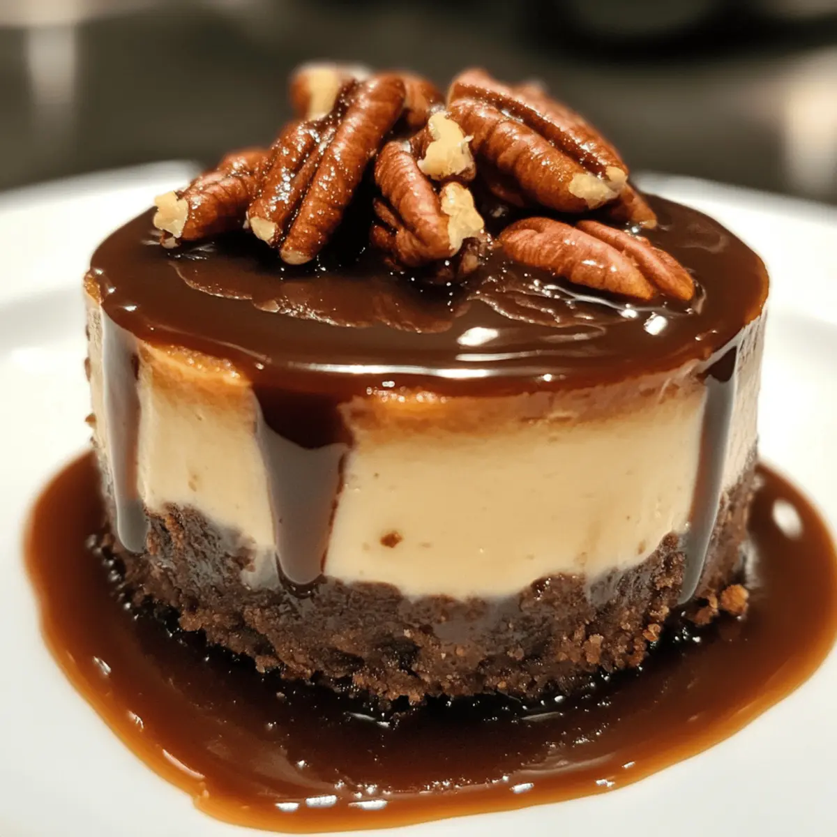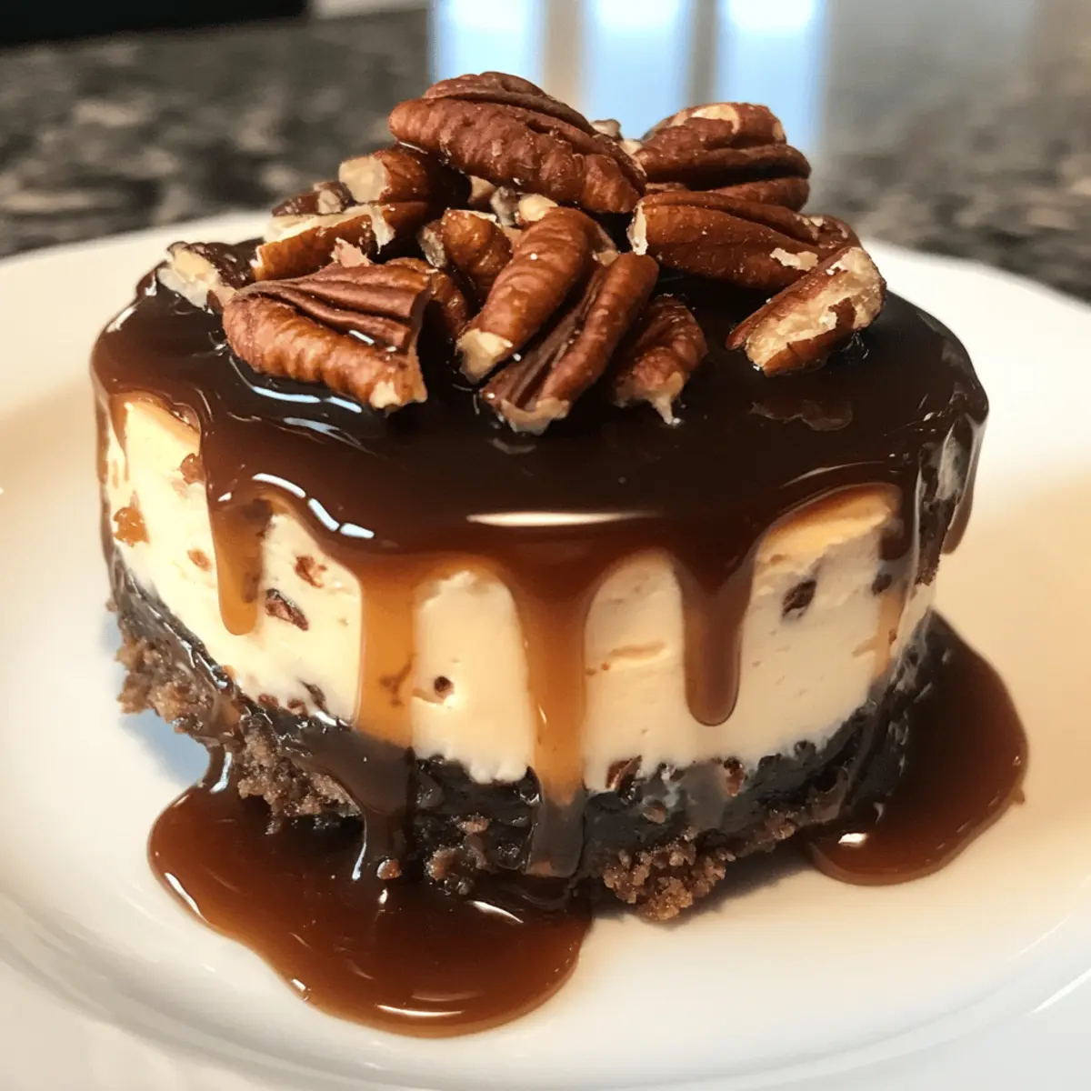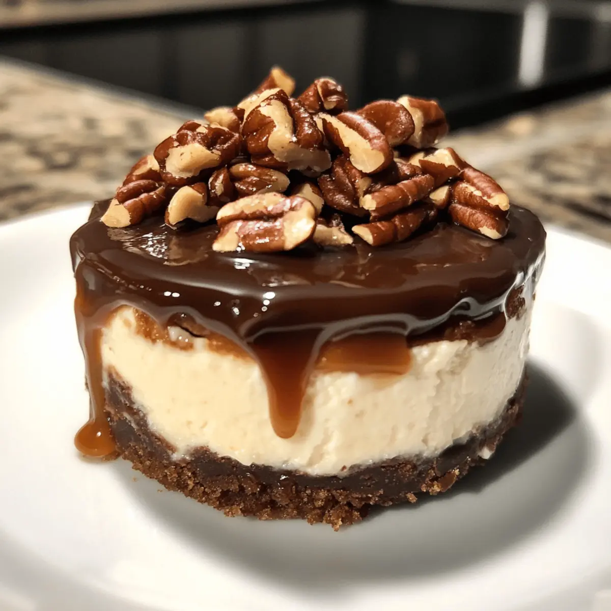 As I stood over a warm oven, the inviting aroma of sweet caramel and rich chocolate wafted through my kitchen, pulling me back to cherished memories of childhood candy treats. These Mini Turtle Cheesecakes are a delightful twist on the classic turtle candy, melding creamy caramel and crunchy pecans into individual desserts that are as easy to make as they are delectable. Ideal for any gathering or a sweet personal indulgence, this recipe has you covered—each mini cheesecake packs a punch of flavor in a perfectly portioned serving. Whether you’re hosting a dinner party or just craving something special after a long day, these cheesecakes are the answer. Can your sweet tooth handle the temptation of such delightful bites? Why are Mini Turtle Cheesecakes a Must-Try? Indulgent flavors await you in these Mini Turtle Cheesecakes, which combine the best elements of classic turtle candy into a creamy, dreamy treat. Perfectly portioned, they offer guilt-free enjoyment without the fuss of a full-sized cake. Quick and easy, even beginners can whip these up in no time! Versatile enough to tailor with different toppings, you can easily switch up the flavors or go nut-free. These cheesecakes are sure to impress at gatherings, making them a crowd-pleaser that keeps everyone coming back for more. If you love the rich and luscious taste of desserts like Elis Cheesecake Eli or the unique essence of Berry Swirl Cheesecake, these mini delights are bound to become a favorite! Turtle Cheesecake Ingredients For the Crust Honey Graham Crackers – The base structure of the crust; substitute with gluten-free crackers for a delightful, gluten-free option. Pecan Pieces – Adds nuttiness and crunch to the crust and topping; can easily be replaced with walnuts for a different flavor. Salted Butter – Binds the crust ingredients together for a rich taste; using unsalted butter works too if you want to control the saltiness. For the Ganache Dark Chocolate Chips – Forms the luxurious chocolate ganache; semisweet chocolate can be used for a sweeter touch. Heavy Cream – Melts with chocolate to create a sumptuous ganache; no substitutes are recommended for optimal texture. For the Cheesecake Filling Cream Cheese – The star ingredient for the cheesecake filling, providing richness and creaminess; Neufchâtel cheese makes a lighter alternative. Salted Caramel Sauce – Flavors the cheesecake and enhances the topping; feel free to use store-bought or homemade versions. Granulated Sugar – Sweetens the filling; you can substitute with other sweeteners, but adjust the quantities accordingly. Vanilla Extract – Elevates the flavor of the filling; pure vanilla extract is preferred for the best results. Large Eggs – Help bind the cheesecake filling and set it properly; ensure they are at room temperature for smoother mixing. For Garnishing Additional Pecans – Used to garnish on top for added texture; omit if you’re aiming for a nut-free dessert. Additional Salted Caramel Sauce – Drizzle over the mini cheesecakes just before serving for an extra indulgent touch; consider swapping with chocolate sauce for a different flair. Step-by-Step Instructions for Mini Turtle Cheesecakes Step 1: Preheat the Oven Begin by preheating your oven to 350°F (175°C). As it warms up, line a standard muffin pan with 12 paper liners, ensuring they are set securely to prevent any spills. This is the first step to creating your delightful Mini Turtle Cheesecakes, so take your time to get it just right. Step 2: Prepare the Crust In a food processor, pulse the honey graham crackers and pecan pieces until you achieve fine crumbs. Once done, melt the salted butter and mix it with the crumb mixture. Divide this buttery blend evenly among the muffin liners, pressing down firmly to create a compact crust. The texture should be slightly firm yet crumbly, ready to hold all the cheesecake goodness. Step 3: Make the Ganache Next, prepare the chocolate ganache by heating dark chocolate chips and heavy cream together. You can do this in the microwave or over a double boiler until the mixture is smooth and glossy. Once ready, spoon a generous teaspoon of the ganache onto each crust, allowing it to start setting slightly before you move on to the filling. Step 4: Prepare the Cheesecake Filling In a large mixing bowl, blend cream cheese, salted caramel sauce, granulated sugar, and vanilla extract until the mixture is creamy and smooth. To avoid incorporating too much air, mix on low speed. Next, add in the large eggs one at a time, pulsing just until combined. This rich filling will complete your Mini Turtle Cheesecakes with an irresistible flavor. Step 5: Fill the Liners Carefully divide the cheesecake filling evenly among the prepared crusts filled with ganache. It should fill each liner to about three-quarters full, leaving a little room for the cheesecakes to rise slightly during baking. This ensures that each Mini Turtle Cheesecake will be perfectly portioned and deliciously rich. Step 6: Bake the Cheesecakes Place the muffin pan in your preheated oven and bake for 18 to 21 minutes. You’ll know they’re done when the edges are set, but the centers remain slightly jiggly. Keep an eye on them to prevent overbaking; the perfect Mini Turtle Cheesecakes are creamy and smooth. Step 7: Cool the Cheesecakes Once baked, remove the muffin pan from the oven and let the cheesecakes cool in the pan for about an hour. This cooling period helps them firm up a bit, making it easier to transfer them later. After an hour, carefully move them to a wire rack to cool completely, allowing the delicious flavors to meld together. Step 8: Top and Chill Before serving, drizzle the remaining chocolate ganache over the cooled cheesecakes and sprinkle additional pecan pieces on top for a delightful crunch. Finish with a generous drizzle of salted caramel sauce, then refrigerate the mini cheesecakes for at least 2 hours. This chilling time ensures they set perfectly, m