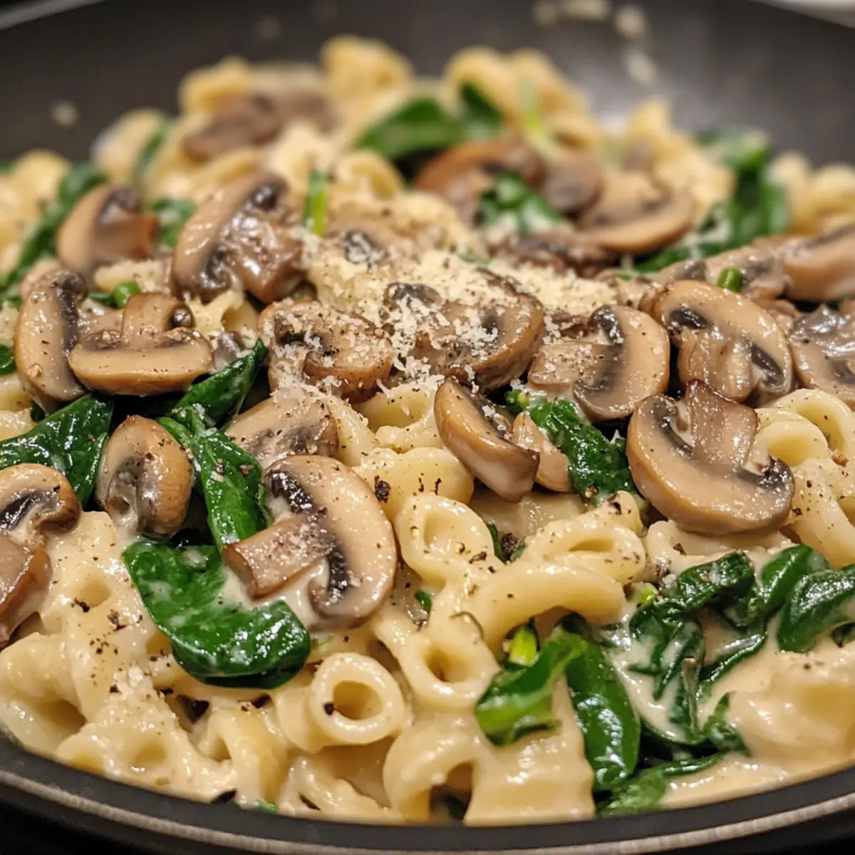 “Pasta is love,” I overheard a friend declare as she twirled another forkful of her favorite dish. For anyone who shares that sentiment, this Creamy Tuscan Mushroom Pasta Skillet is about to become your go-to weeknight dinner. With just 30 minutes needed to whip up this comforting meal, it beautifully combines rich flavors and a velvety sauce that can make even the busiest of days feel special. As a vegetarian triumph, this skillet recipe not only satisfies cravings but also nourishes your soul, making it perfect for a family gathering or a cozy night in. Imagine a dish that feels like a warm embrace, and allows you to put away the takeout menus for good. Curious about how to bring a taste of Italy to your table tonight? Let’s dive in! Why is this Pasta Skillet So Special? Quick Preparation: In just 30 minutes, you can create a gourmet meal that rivals restaurant quality. Delicious Flavor Burst: The rich umami from mushrooms combined with creamy sauce makes every bite a pleasure. Nutrient-Packed: Packed with fresh spinach, it adds a pop of color and essential nutrients. Versatile Choice: Feel free to customize it with your favorite vegetables or proteins for a personal touch. Crowd-Pleasing Appeal: Perfect for family dinners or entertaining friends, it’s a dish sure to impress everyone! Looking for more ideas? You might also enjoy this Easy Broccoli Mushroom Stir or the delightful Pistachio Mushroom Cheesecake for dessert! Tuscan Mushroom Pasta Skillet Ingredients • For the Pasta Pasta – Choose any type; whole wheat or gluten-free works great as substitutes to meet your dietary preferences. • For the Base Olive Oil – This adds flavor and prevents sticking; alternatively, you can use butter or avocado oil. Mushrooms – The star of the dish, contributing rich umami flavor; shiitake or cremini also make excellent alternatives. Garlic – Fresh garlic enhances the overall taste; if in a pinch, garlic powder can be used, but in smaller amounts. • For the Greens Fresh Spinach – Offers color and nutrition with a slight earthiness; feel free to swap with kale or Swiss chard for variety. • For the Creamy Sauce Heavy Cream – Essential for the creamy texture of the sauce; half-and-half or coconut milk can lighten it up or make it dairy-free. Parmesan Cheese – Adds a rich flavor; for a dairy-free option, use nutritional yeast in place of grated cheese. Salt and Pepper – Key for seasoning; adjust to your taste preferences. With these ingredients in hand, you’re just a step away from savoring this delightful Tuscan Mushroom Pasta Skillet at your dinner table! Step‑by‑Step Instructions for Creamy Tuscan Mushroom Pasta Skillet Step 1: Boil the Pasta Begin by bringing a large pot of salted water to a rolling boil over high heat. Once boiling, add your preferred pasta and cook according to the package instructions, typically about 8 to 10 minutes, until al dente. Drain the pasta in a colander, but don’t rinse it; the starch helps the sauce adhere better. Set the pasta aside. Step 2: Sauté the Mushrooms In a large skillet, heat 2 tablespoons of olive oil over medium heat. Once the oil shimmers, add the sliced mushrooms, ensuring they are spread out for even cooking. Sauté the mushrooms for 5 to 7 minutes, stirring occasionally, until they turn golden brown and tender. This step enhances their flavor, making them a delightful addition to your Tuscan Mushroom Pasta Skillet. Step 3: Infuse Garlic and Spinach After the mushrooms are beautifully golden, stir in 3 cloves of minced garlic and cook for about 1 minute, just until fragrant. Next, add the fresh spinach to the skillet, stirring continuously for about 2 minutes until it wilts down. The vibrant green spinach enriches the dish while adding nutritional value, creating a colorful base for the creamy sauce. Step 4: Create the Creamy Sauce Pour in 1 cup of heavy cream and bring the mixture to a gentle simmer over medium-low heat. Stir continuously as you sprinkle in ½ cup of grated Parmesan cheese, allowing it to melt and combine seamlessly into the sauce. If the sauce is too thick, use a splash of the reserved pasta water to reach your desired consistency. You’re now well on your way to a delicious Creamy Tuscan Mushroom Pasta Skillet! Step 5: Combine Pasta and Sauce Add the drained pasta directly into the skillet, gently tossing it with your creamy mushroom sauce to ensure every strand is coated. Continue to cook for an additional 2 to 3 minutes, allowing the flavors to meld together. Taste the pasta and season with salt and freshly cracked pepper according to your preference, creating a perfect balance of flavors. Step 6: Serve and Garnish Once everything is well combined and heated through, serve the Creamy Tuscan Mushroom Pasta Skillet warm. For an extra touch, garnish each plate with fresh basil leaves for a pop of color and an aromatic finish. Enjoy this comforting dish that makes any weeknight dinner feel special! Expert Tips for Tuscan Mushroom Pasta Skillet Perfect Pasta Timing: Ensure your pasta is cooked al dente; it will finish cooking in the sauce. Overcooked pasta turns mushy, which you want to avoid for this Tuscan Mushroom Pasta Skillet. Flavorful Oil: Use high-quality olive oil; it enhances the dish’s richness. If you opt for butter, be careful not to let it burn while sautéing the mushrooms. Garlic Care: Sauté garlic just until fragrant. Burning it can introduce bitterness to your sauce, overshadowing the lovely flavors of the mushrooms. Creaminess Control: Adjust the thickness of your sauce by adding reserved pasta water. This helps bind the sauce to the pasta for the perfect finish. Season Last: Always taste and adjust salt and pepper after combining the pasta with the sauce. Final seasoning is key for a standout Tuscan Mushroom Pasta Skillet. What to Serve with Creamy Tuscan Mushroom Pasta Skillet There’s nothing quite like complementing your skillet with sides that enhance its creamy good