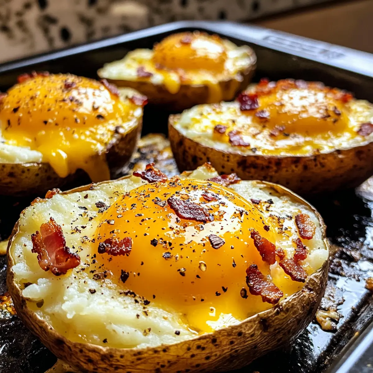 Spoon the mashed potato mixture back into each hollowed potato skin, ensuring it’s generously filled. Create a well in the center of each filled potato, and add crispy beef bacon and a generous amount of cheddar cheese. Crack a large egg into each well with care, keeping the yolk intact for a visually appealing finish.