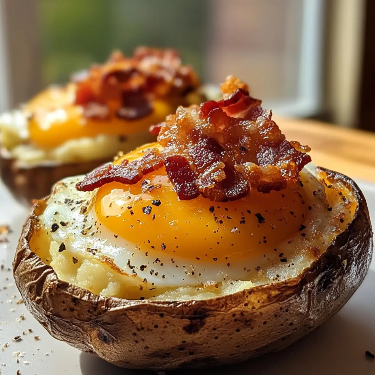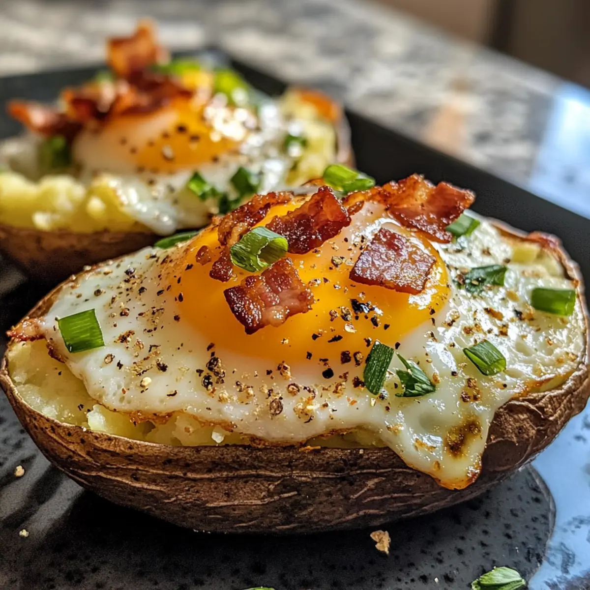 Twice Baked Loaded Breakfast Potatoes bring cozy indulgence to your brunch, featuring crispy potatoes, creamy filling, smoky bacon, and a baked egg.