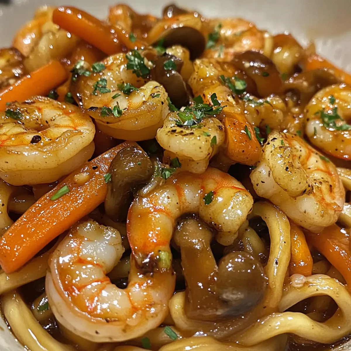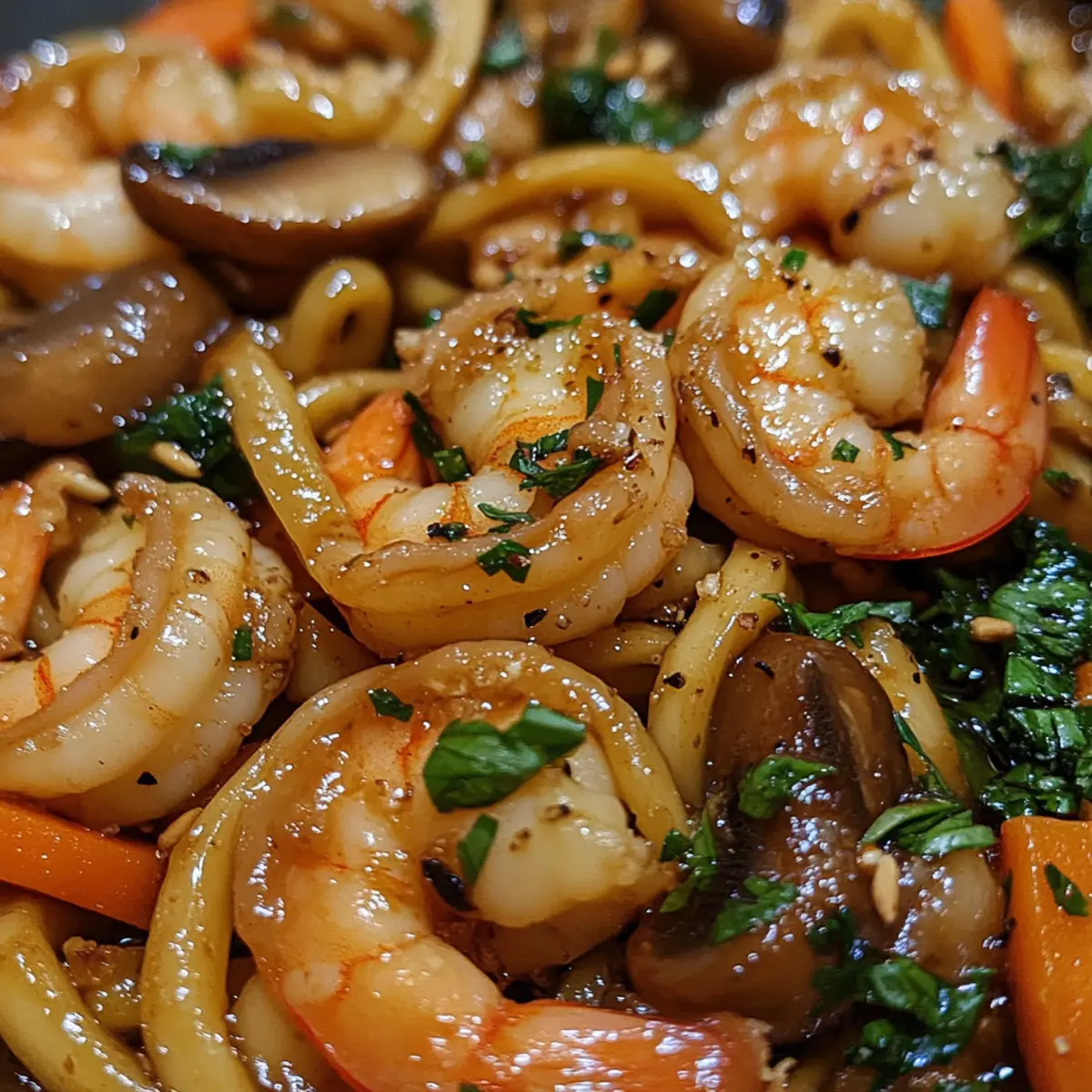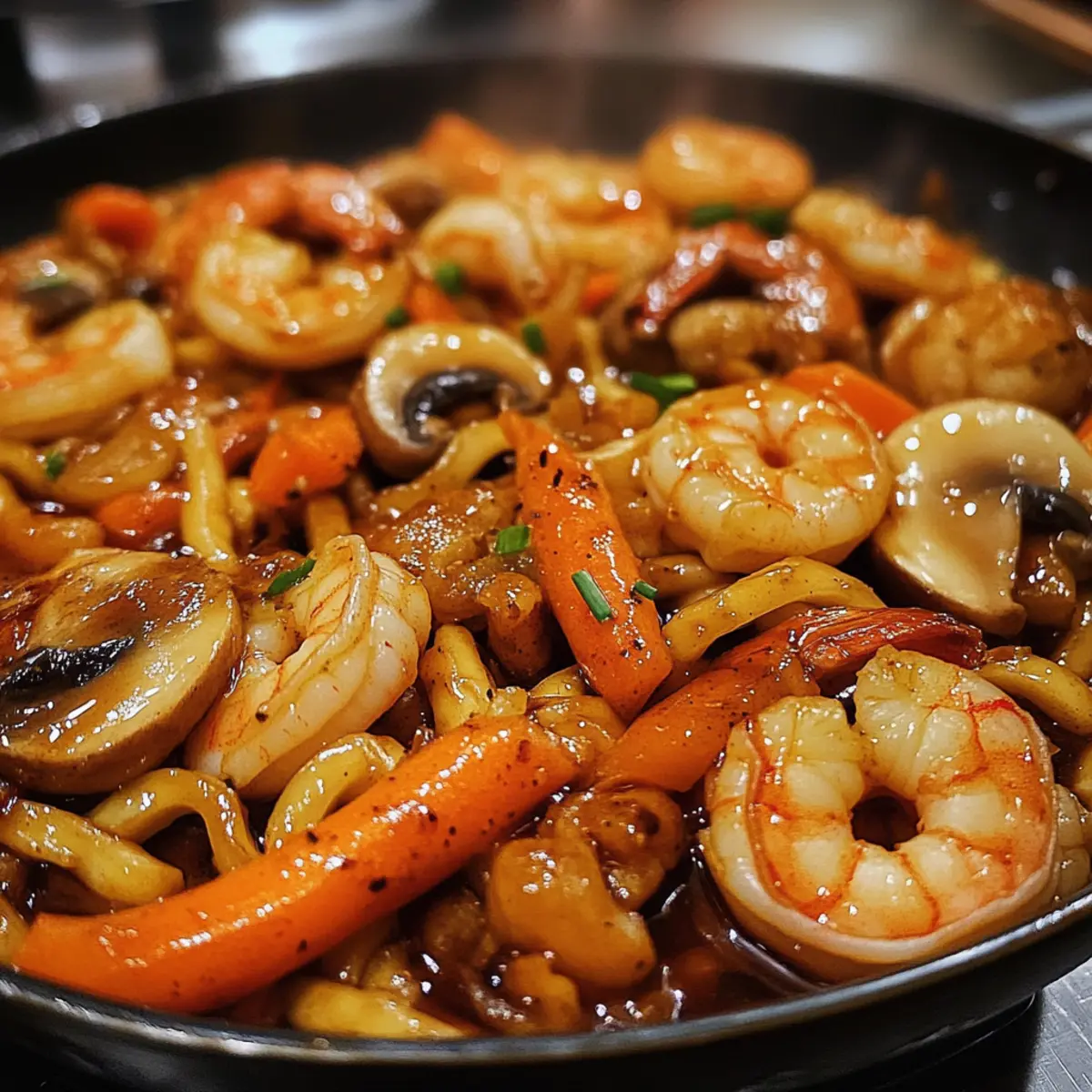 As I stood in my kitchen, the aromatic sizzle of garlic and shrimp danced through the air, whisking me away to cozy izakayas of Japan. This is the magic of Quick and Savory Yaki Udon with Shrimp, a dish where tender, chewy udon noodles meet vibrant vegetables in a rich, glossy sauce. In just 20 minutes, you can whip up a nourishing, high-protein meal that transforms busy weeknights into a culinary celebration! Whether you’re a seasoned home chef or just looking to ditch the fast food routine, this delightful stir fry promises to satisfy your cravings while being easy on your schedule. Are you ready to bring a little taste of Japan to your dinner table? Let’s dive into how to create this comforting dish! Why is Yaki Udon with Shrimp a must-try? Quick Cooking: In just 20 minutes, you can enjoy a delicious, home-cooked meal that keeps you away from takeout. Savory Satisfaction: The combination of sautéed shrimp, fresh veggies, and chewy udon noodles creates a mouthwatering flavor explosion that indulges your taste buds. Versatile Base: Feel free to tailor the recipe to your liking! Swap shrimp for chicken or tofu, or pile on your favorite veggies—this dish can adapt to suit any taste. Nutrient-Packed: With a healthy dose of protein and fiber, Yaki Udon with Shrimp makes for a filling meal that keeps you energized. Crowd-Pleaser: This recipe is perfect for family dinners or entertaining friends. Pair it with sides like steamed dumplings or pickled ginger for a complete experience, elevating your home-cooked meal to restaurant quality. Yaki Udon with Shrimp Ingredients For the Noodles • Udon Noodles – Provides the hearty base of the dish; preferably vacuum-packed for convenience. For the Stir-Fry • Neutral Oil – Used for frying; can substitute any mild vegetable oil. • Shrimp – Adds protein and a seafood flavor; use peeled and deveined shrimp for ease. • Garlic – Infuses the dish with aromatic depth. • Yellow Onion – Adds sweetness and texture; can substitute with white or red onion. • White Mushrooms – Contributes umami; can replace with shiitake or button mushrooms. • Carrot – Offers crunch and color; can use bell pepper for a different texture. • Spring Onion – Provides freshness; use both green and white parts for flavor balance. For the Sauce • Soy Sauce – Adds saltiness; a combination of regular and dark soy sauce enhances flavor complexity. • Oyster Sauce – Provides a rich depth; can be substituted with vegetarian oyster sauce for a plant-based option. • Dark Soy Sauce – Gives color and flavor; ensure it is not confused with regular soy sauce. • Rice Vinegar – Offers acidity and brightness; can replace with apple cider vinegar. • Brown Sugar – Balances flavor; can substitute with coconut sugar or honey. • Freshly Crushed Black Pepper – Adds heat; adjust quantity to taste. • Toasted Sesame Oil – Enhances the dish with a nutty aroma; do not substitute with regular sesame oil. This collection of ingredients will bring your Yaki Udon with Shrimp to life in just 20 minutes! Step‑by‑Step Instructions for Yaki Udon with Shrimp Step 1: Boil the Noodles Start by bringing a large pot of salted water to a boil. Once boiling, add the udon noodles and cook according to the package instructions, usually about 3–4 minutes, until just tender. Drain the noodles in a colander and rinse them under cold water to stop the cooking process, then drizzle with a bit of neutral oil to prevent sticking, and set aside. Step 2: Sauté the Garlic and Mushrooms In a large skillet or wok, heat 1 tablespoon of neutral oil over medium heat. Once hot, add the minced garlic and sauté for about 30 seconds until fragrant, taking care not to burn it. Next, toss in the sliced white mushrooms and cook for another 2–3 minutes, stirring occasionally, until they are tender and have released their moisture, then remove them from the pan and set aside. Step 3: Cook the Vegetables In the same pan, add the yellow onion and julienned carrot. Stir-fry these vegetables for about 2-3 minutes, or until they soften and start to caramelize slightly. Once cooked, season with a pinch of salt and pepper, then remove from the pan and set them aside with the garlic and mushrooms. This step ensures your Yaki Udon with Shrimp has a well-rounded flavor. Step 4: Fry the Shrimp With the pan still over medium-high heat, add 2 tablespoons of oil and let it heat up. Carefully add the peeled and deveined shrimp, cooking for approximately 2-3 minutes until they turn pink and opaque. Once cooked, pour in both the regular and dark soy sauces, stirring to coat the shrimp evenly, then season with a sprinkle of black pepper to enhance the flavor. Step 5: Mix in the Noodles Now it’s time to bring together your Yaki Udon meal! Add the pre-cooked udon noodles to the pan with the shrimp, stirring continuously for about 3–4 minutes over high heat. Keep mixing until the noodles are heated through and start to develop slight crispy edges, creating a delightful texture that complements the shrimp and vegetables. Step 6: Add Vegetables and Sauce Gently return the sautéed garlic, mushrooms, yellow onion, and carrot to the skillet, mixing them in with the noodles. Pour the prepared sauce mixture of oyster sauce, rice vinegar, and brown sugar over the entire dish, stirring well to coat everything evenly for about another minute. Step 7: Garnish and Serve Once well combined and heated through, remove the pan from the heat. Transfer your Yaki Udon with Shrimp to a serving dish and sprinkle with chopped spring onions for a fresh finish. Serve your dish hot, perhaps with a side of pickled ginger, and enjoy the delightful mix of flavors and textures! What to Serve with Yaki Udon with Shrimp? Transform your dinner into a culinary journey with these delightful pairings that enhance your vibrant Yaki Udon with Shrimp. Steamed Dumplings: These fluffy pockets filled with savory goodness complement the