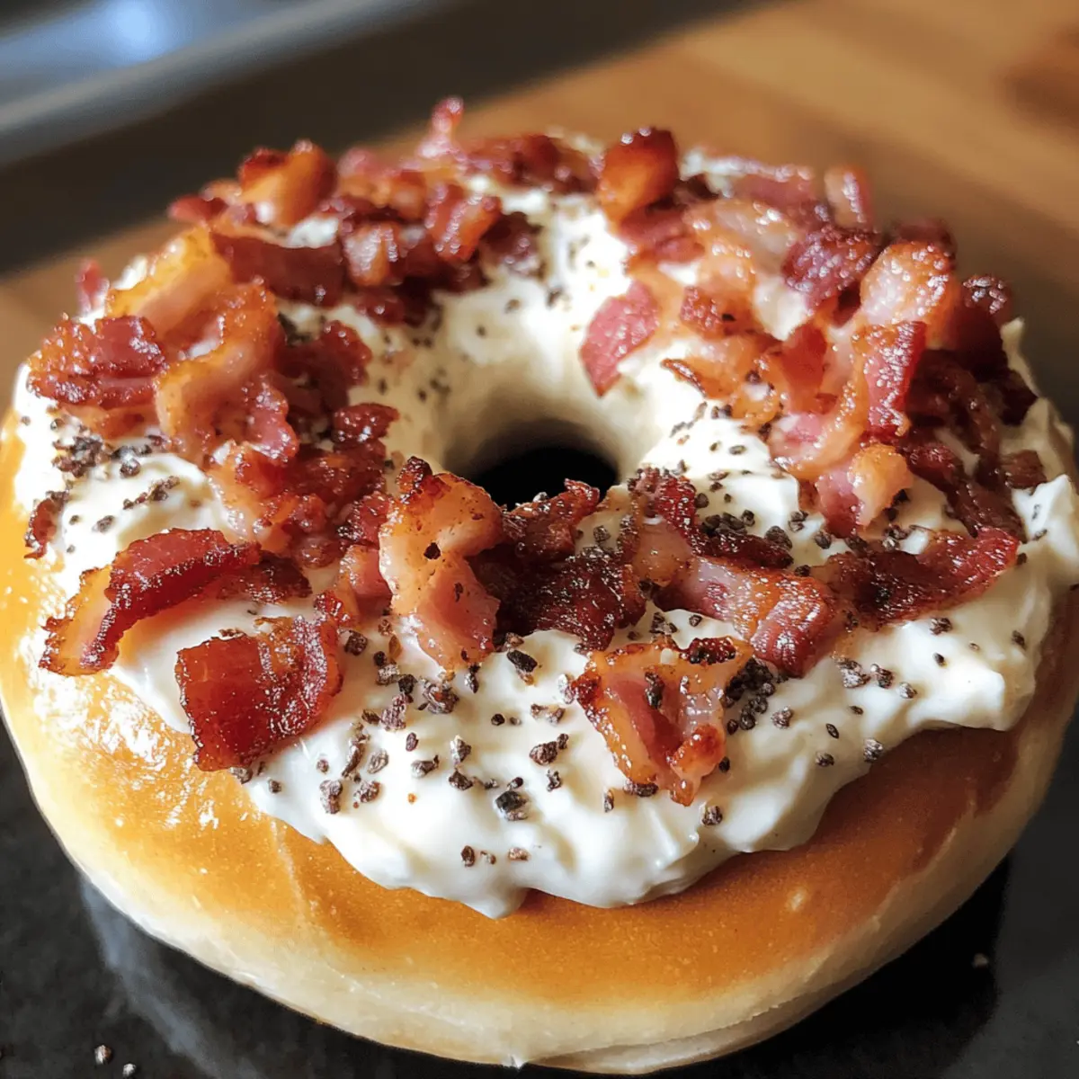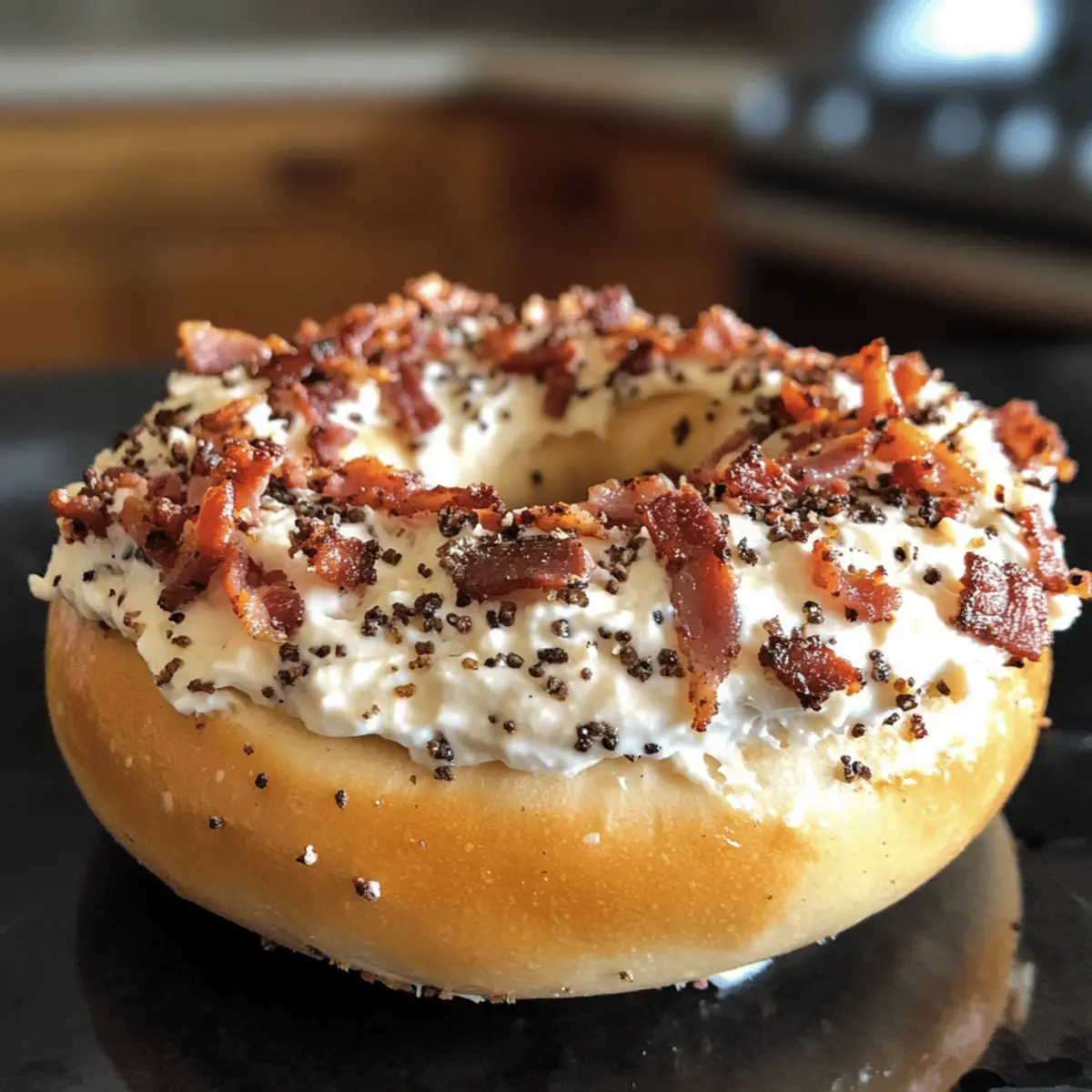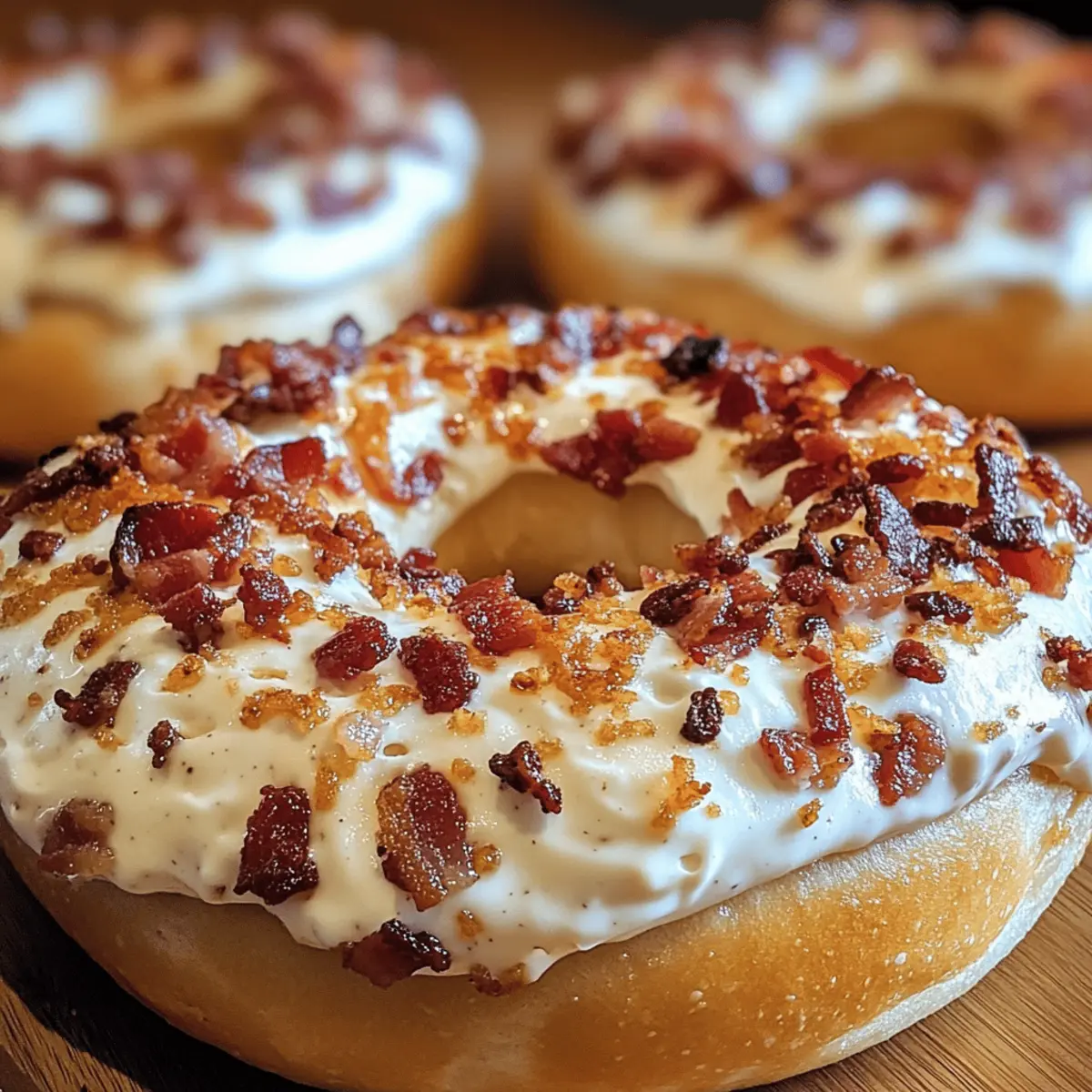 As I stood in my kitchen, the inviting aroma of sizzling bacon filled the air, instantly transporting me to cozy Sunday brunches. That’s when the idea for these Zesty Bacon Cream Cheese Bagels sparked—an easy breakfast comfort food that feels indulgent without all the fuss. Imagine biting into a warm, toasted bagel, its crispy exterior giving way to a rich, creamy filling that’s both savory and satisfying. This adaptable recipe not only caters to various bagel options—like everything or onion—but also makes for a fantastic meal prep idea, keeping your mornings exciting and stress-free. Whether you’re whipping them up for a family gathering or enjoying a quiet morning alone, these bagels are bound to become a favorite. Ready to transform your breakfast routine? Dive in and discover the joy of crafting these delicious treats! Why Are These Bagels So Irresistible? Deliciously Decadent: Each bite of these bagels delivers a satisfying combination of crispy bacon and creamy cheese that is truly indulgent. Endless Adaptability: With options for various bagel types like plain or everything, you can easily customize them to suit your taste and pantry. Time-Saving Meal Prep: Perfect for busy mornings, whip up the cream cheese mixture ahead of time and assemble your bagels in minutes! Crowd-Pleasing Comfort: Impress family and friends with a dish that feels gourmet yet is incredibly easy to make—ideal for brunch gatherings, much like my Ham Egg Cheese Croissant Sandwich. Simple Ingredients: You likely have most components in your kitchen already—making it a hassle-free choice when cravings strike. Zesty Bacon Cream Cheese Bagels Ingredients For the Bagels • Bagels – Use fresh, dense varieties for the best texture; avoid pre-sliced options. For the Cream Cheese Mixture • Cream Cheese – Full-fat is best for a rich, creamy mouthfeel; softened for easier mixing. • Shredded Cheddar Cheese – Adds a delicious melty flavor; feel free to substitute with any favorite melting cheese. • Cooked Bacon – Ensure it’s crispy and cooled beforehand to avoid melting the cream cheese. • Mayonnaise – Optional, but adds extra creaminess; substitute with Greek yogurt for a lighter option. • Sour Cream – Boosts richness; Greek yogurt can stand in for a tangy twist. • Hot Sauce – Tailor the spice level to your preference; a teaspoon adds a nice kick! • Salt and Pepper – Adjust to taste for seasoning. For the Garnish • Reserved Bacon – Sprinkle on top for added crunch and flavor before serving. • Chives – Fresh chives add a delightful touch and fresh flavor contrast. These Zesty Bacon Cream Cheese Bagels are perfect for elevating your breakfast experience! Enjoy the ease of making them at home and the joy they bring to every bite. Step‑by‑Step Instructions for Zesty Bacon Cream Cheese Bagels Step 1: Prepare the Cream Cheese Mixture In a medium bowl, combine softened cream cheese, shredded cheddar cheese, diced cooked bacon, mayonnaise, and sour cream. Add a few dashes of hot sauce, then season generously with salt and pepper. Mix all the ingredients together until smooth, making sure not to over-mix. The consistency should be creamy and easily spreadable, perfect for filling your bagels. Step 2: Hollow the Bagels Take your fresh bagels and slice a thin layer off the bottom to create a flat base. Carefully hollow out the insides using a spoon or bagel hollowing tool, while keeping the top intact. Aim for about half an inch of bagel around the edges; this will create a delightful pocket for the cream cheese mixture without compromising the structure. Step 3: Fill the Bagels Spoon the zesty cream cheese mixture into each hollowed bagel, filling them generously until the mixture is slightly mounded on top. Use a spatula or the back of a spoon to smooth the tops, ensuring an even distribution. Preparing the bagels this way makes for a wonderful balance of flavors and textures with every bite of the Zesty Bacon Cream Cheese Bagels. Step 4: Bake to Perfection Preheat your oven to 190°C (375°F) and arrange the filled bagels on a baking tray lined with parchment paper. Place them in the oven and bake for 12-15 minutes, or until the tops are golden and the mixture is bubbly. Keep an eye on them as they bake, and you’ll know they’re ready when they’re slightly crisp on the edges and the filling is oozing. Step 5: Add Garnishes and Serve Once the Zesty Bacon Cream Cheese Bagels are done baking, remove them from the oven and let them cool slightly. For an extra touch, sprinkle reserved bacon bits and freshly chopped chives on top. Serve your bagels warm for the best experience, either as a delightful breakfast or a satisfying snack that everyone will love. Expert Tips for Zesty Bacon Cream Cheese Bagels Perfect Bagel Choice: Use fresh, dense bagels to ensure they hold up well under the cream cheese mixture. Avoid stale or pre-sliced options that can turn soggy. Cream Cheese Consistency: Make sure your cream cheese is softened but not overly mixed. This will give you the perfect creamy texture that’s easily spreadable but still substantial. Cool the Bacon: Allow cooked bacon to cool completely before mixing it into the cream cheese. This will prevent your filling from becoming too runny and help maintain its structure. Hollow with Care: When hollowing out the bagels, leave enough of the bagel around the edges. This creates a sturdy base while providing a delightful pocket for the filling of Zesty Bacon Cream Cheese Bagels. Garnish for Greatness: Don’t skip the garnishes! Adding reserved bacon bits and chives not only enhances flavor but also makes your bagels visually appealing for serving. Make Ahead Options These Zesty Bacon Cream Cheese Bagels are a fantastic choice for meal prep enthusiasts! You can prepare the cream cheese mixture up to 3 days in advance, storing it in an airtight container in the refrigerator. This allows the flavors to meld beautifully, makin
